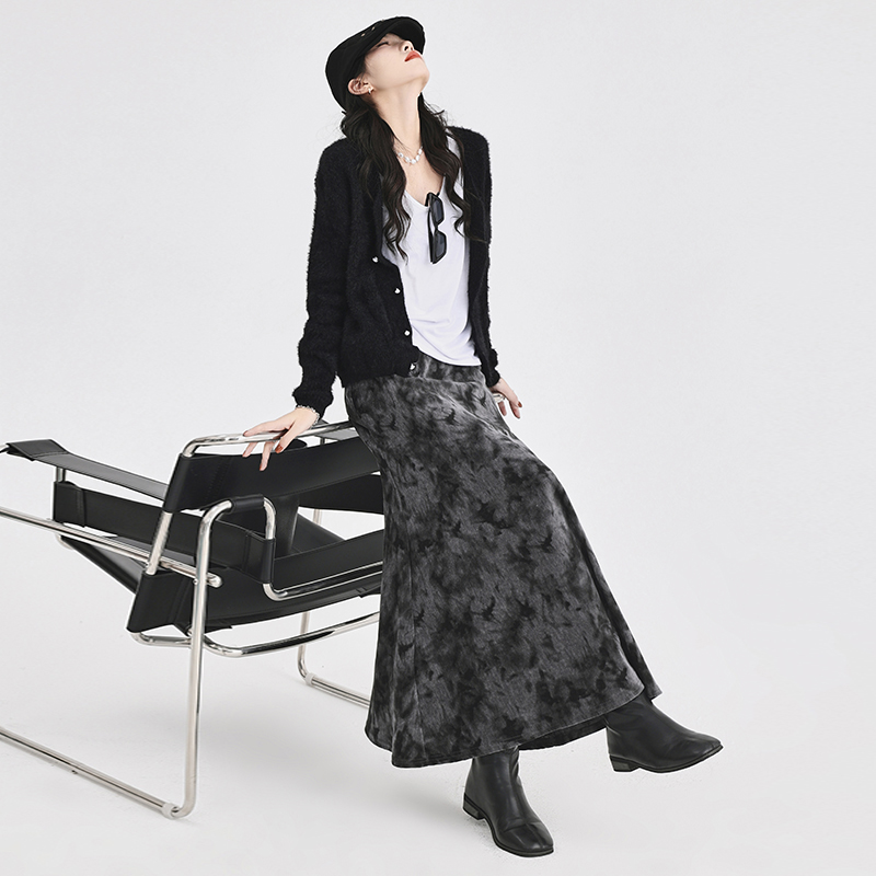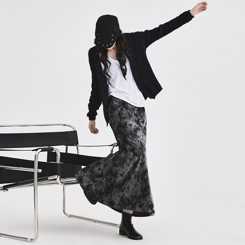 KRO黑色复古扎染半身裙女松紧腰A字包臀裙早春新款 百搭长裙子