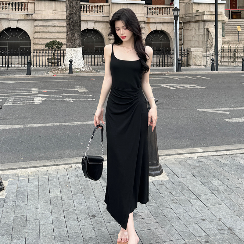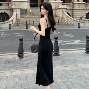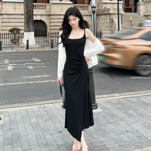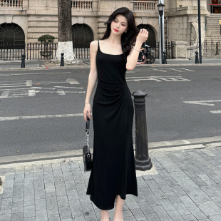莫代尔吊带连衣裙女2025夏秋微胖显瘦气质黑色长裙胖mm裙高腰设计