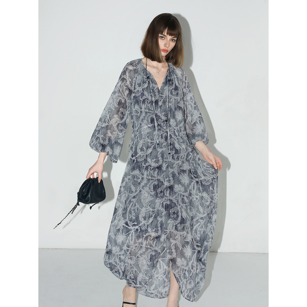 COCOBELLA佩斯利印花雪纺连衣裙女飘逸大摆长裙FR0041 折扣季