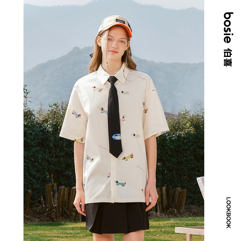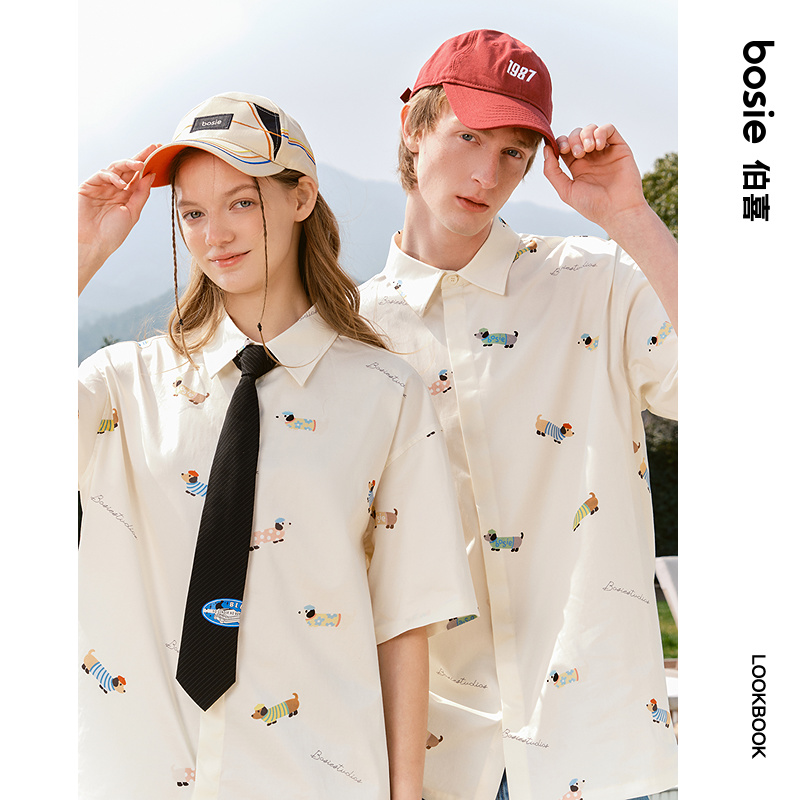 新款 bosie2025年夏季 美式 复古印花短袖 男情侣联名 衬衫 腊肠狗