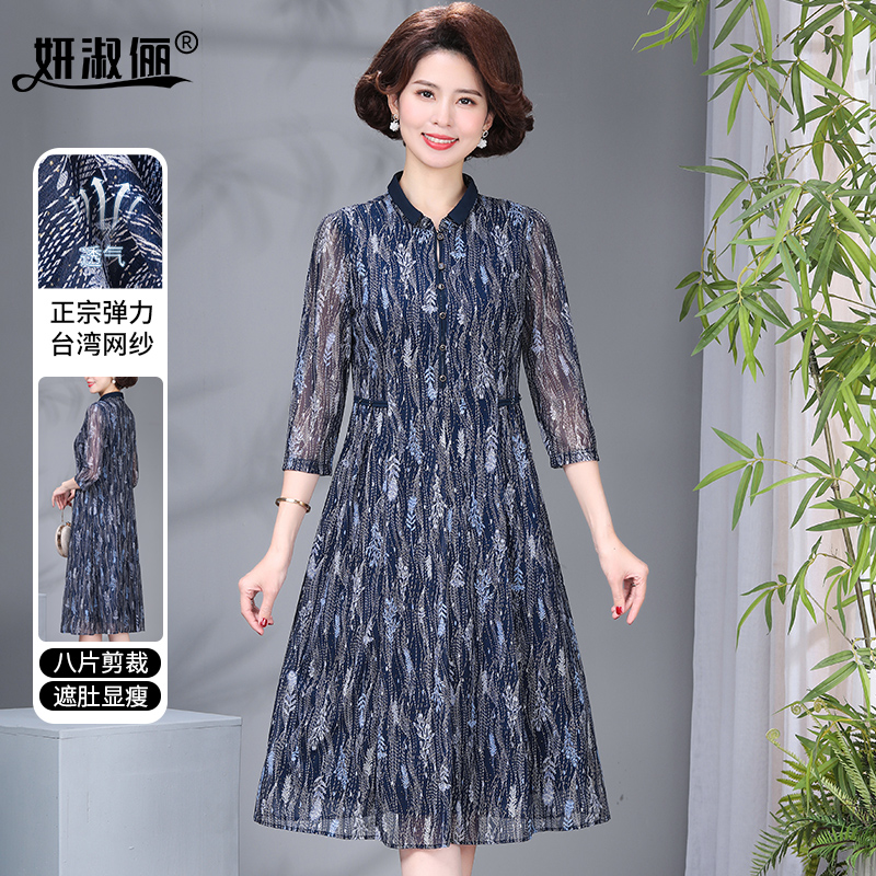 2025新款 连衣裙小翻领春夏装 中年女台湾纱裙 七分袖 妈妈贵夫人大码