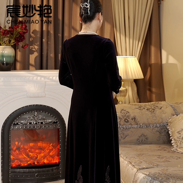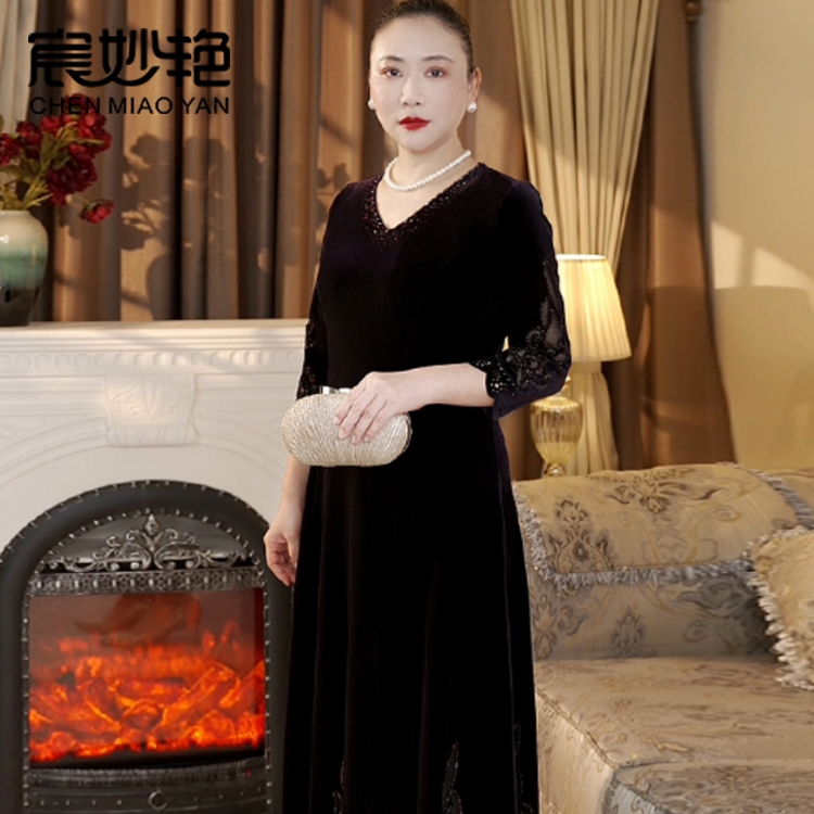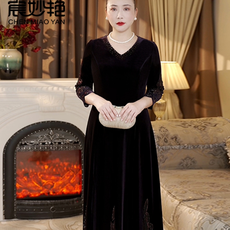 显瘦端庄大气V领丝绒A字裙 连衣裙高贵优雅气质修身 宸妙艳新款 大码