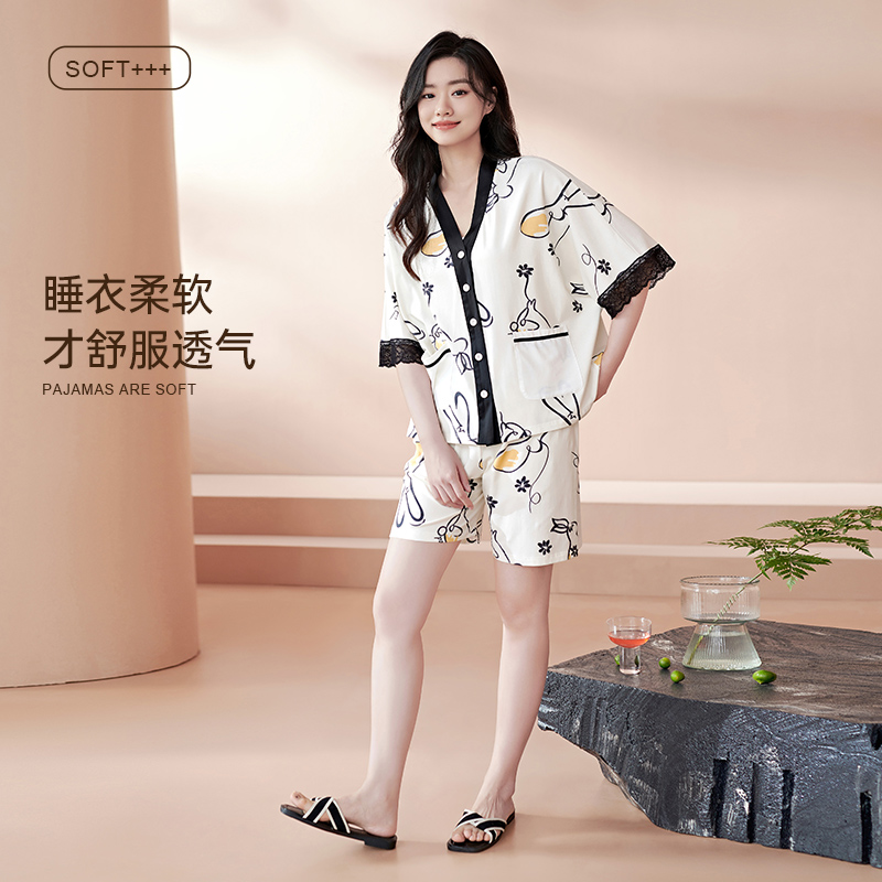 薄款 纯棉睡衣夏季 大码 V领五分袖 女士家居服 玛伦萨 套装 5A抗菌