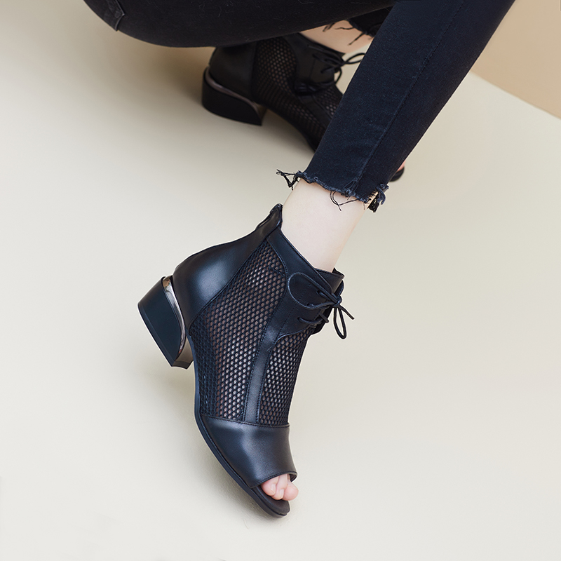女真皮网纱短靴秋季 凉鞋 新款 凉靴女款 秋 中跟透气时尚 吉菲儿鱼嘴鞋