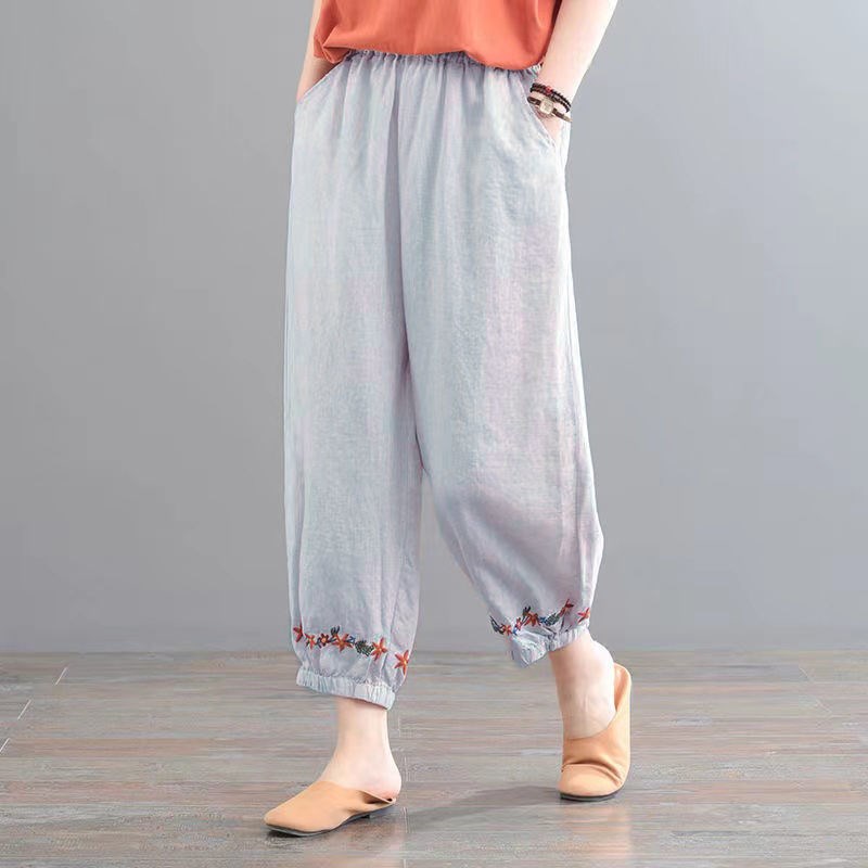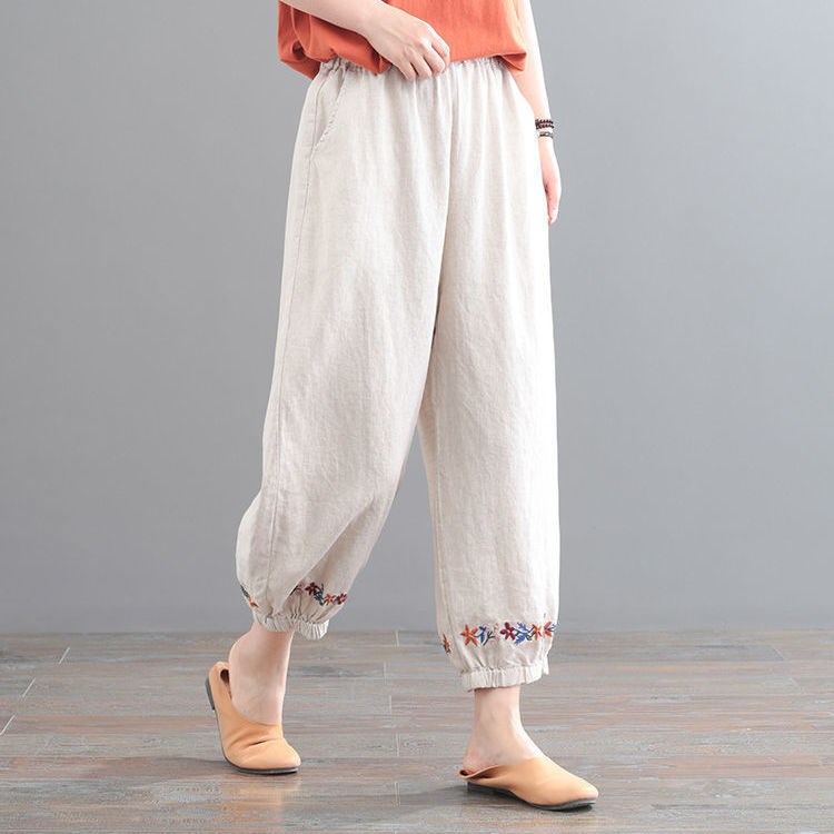 洋气纯色女高腰休闲裤 遮肉九分哈伦裤 女文艺复古大码 刺绣束脚长裤