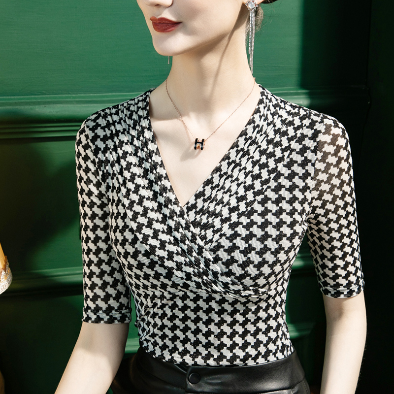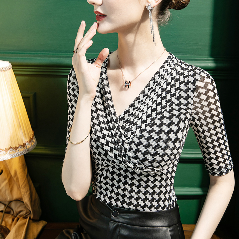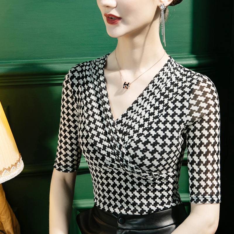 女五分袖 亮丝千鸟格印花V领打底衫 修身 褶皱女装 2025秋季 中袖 新款
