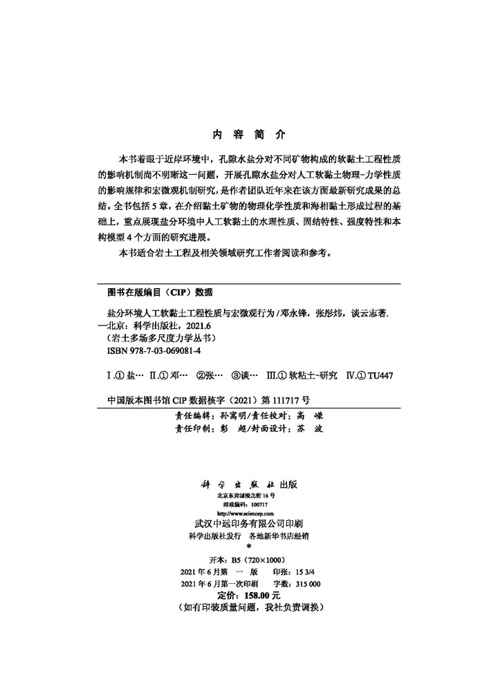 谈云志 张彤炜 盐分环境人工软黏土工程性质与宏微观行为 邓永锋