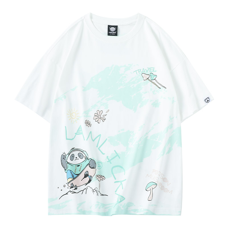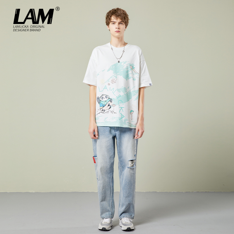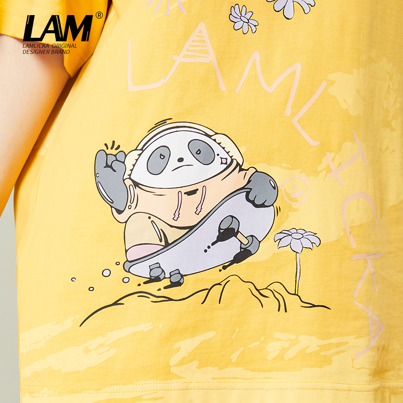 LAMLICKA音乐熊猫联名t恤2024夏季 男 ins潮牌宽松情侣涂鸦印花短袖