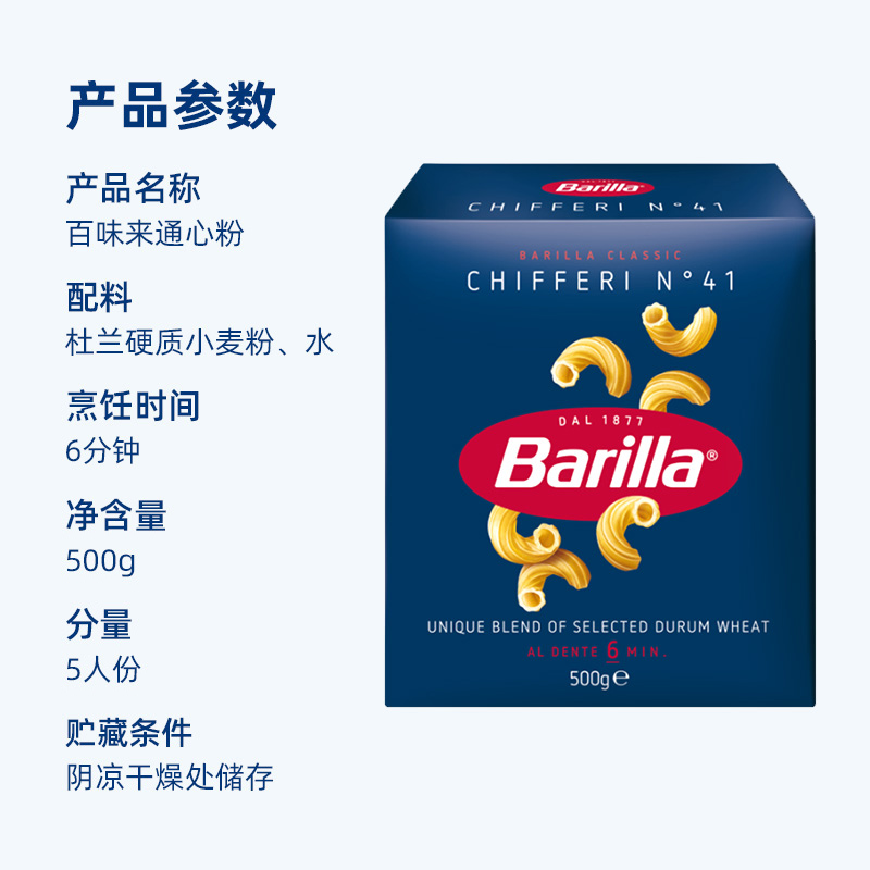 1盒意大利进口 41小弯通500g Barilla 百味来意大利面意粉通心粉