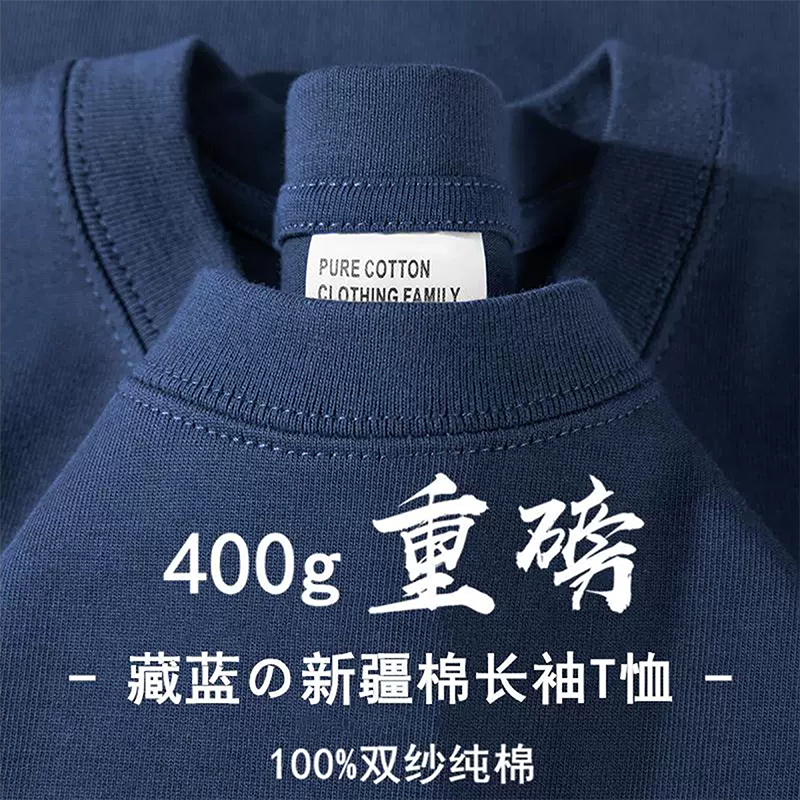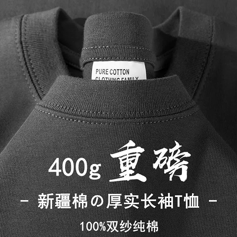宽松休闲纯棉内搭打底衫 新疆棉400g重磅纯色圆领长袖 T恤男女厚款