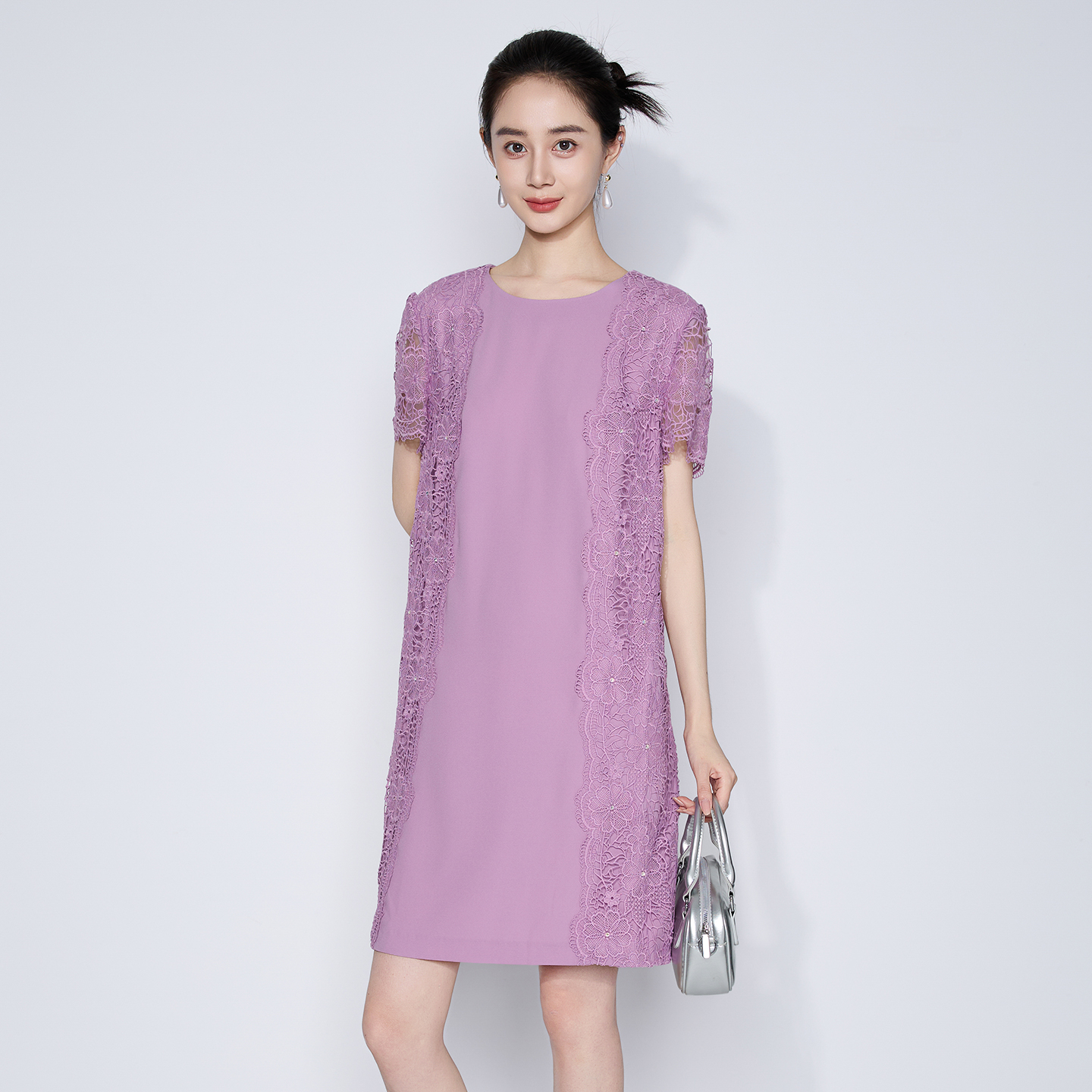 纯色圆领连衣裙子蕾丝花边短袖 新款 气质女 马天奴2025夏季 专柜正品