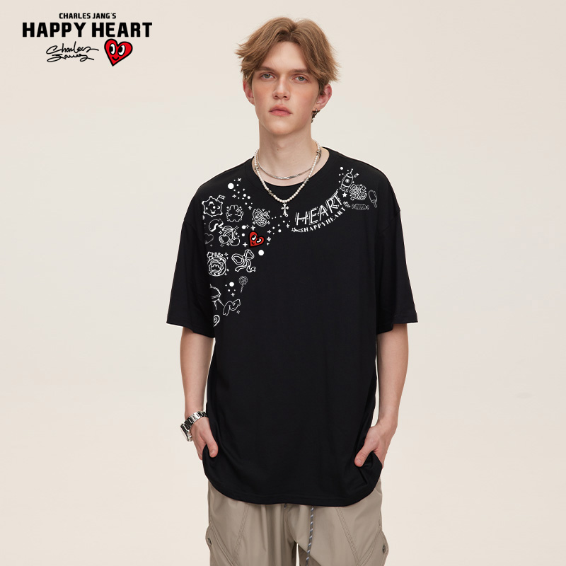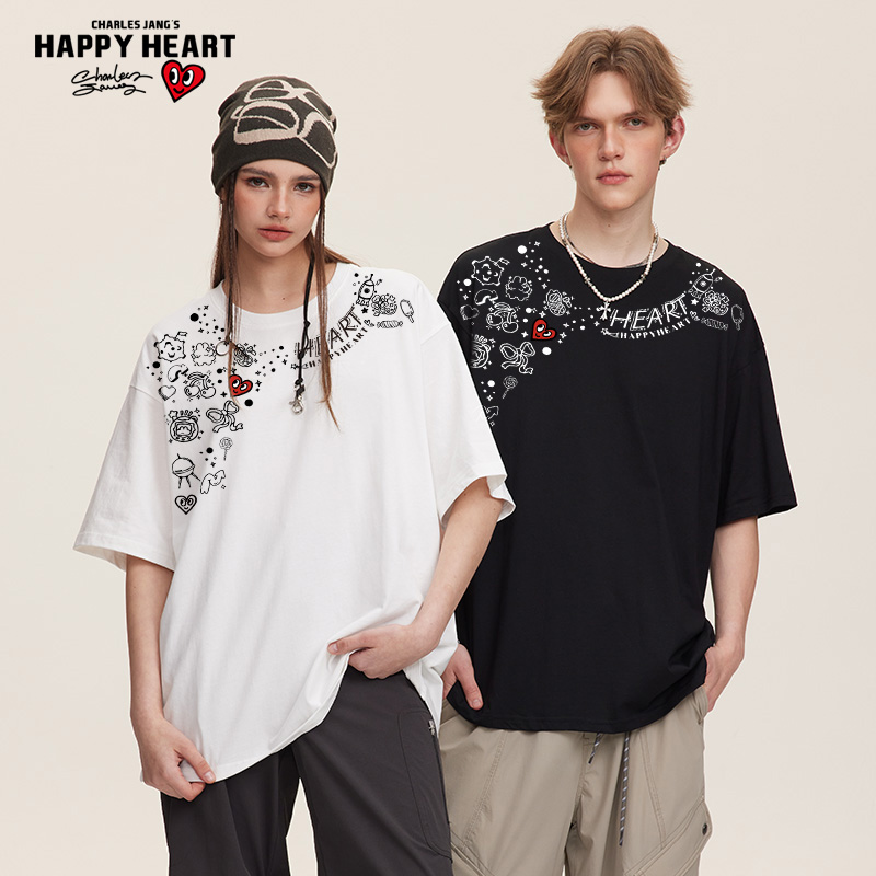 圆领半袖 查尔斯桃心 t恤男纯棉潮牌夏季 趣味图案涂鸦印花短袖 美式