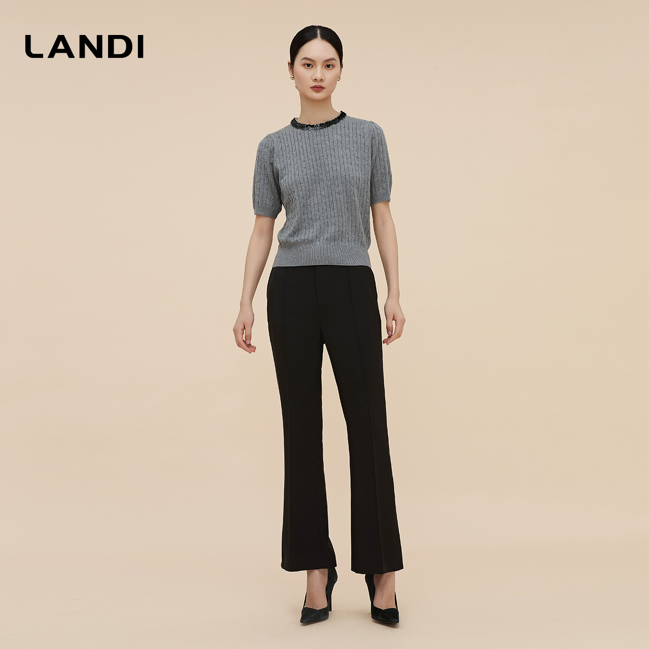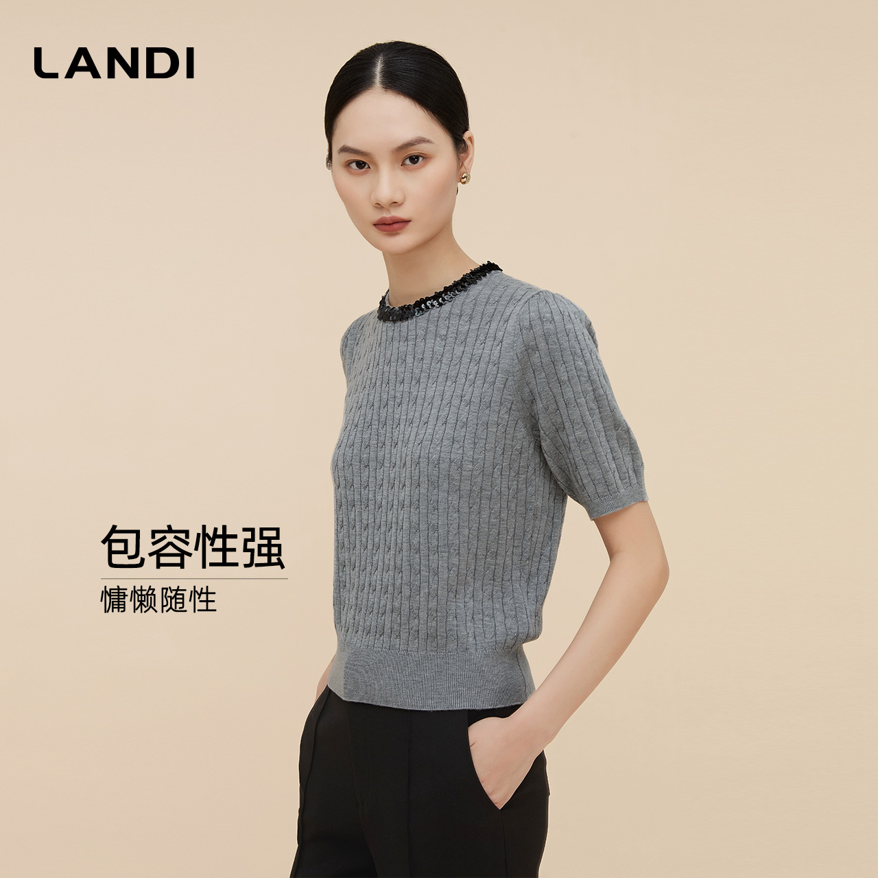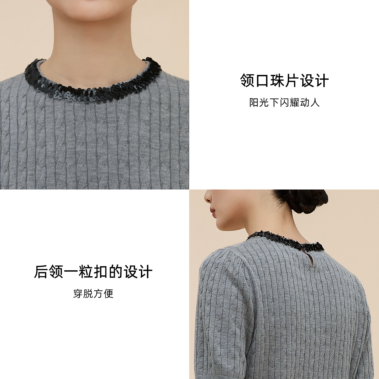 女2025秋新品 LANDI智雅灰绞花珠片气质圆领羊毛针织衫 百搭显瘦