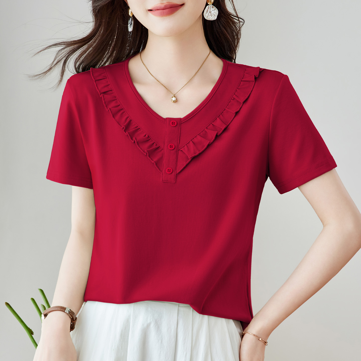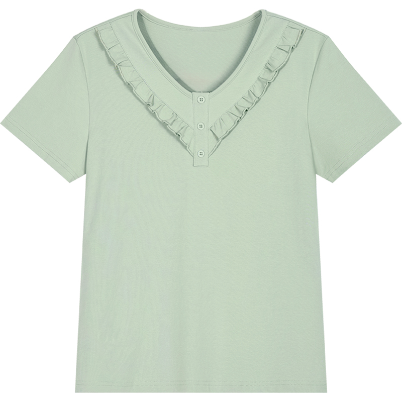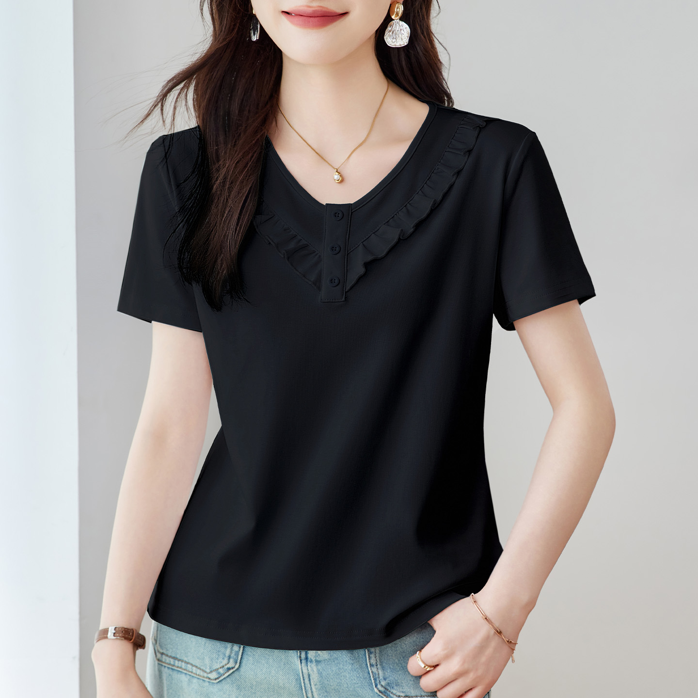 女t恤2025新款 设计感气质上衣纯色体恤衫 夏季 修身 女装 v领正肩短袖