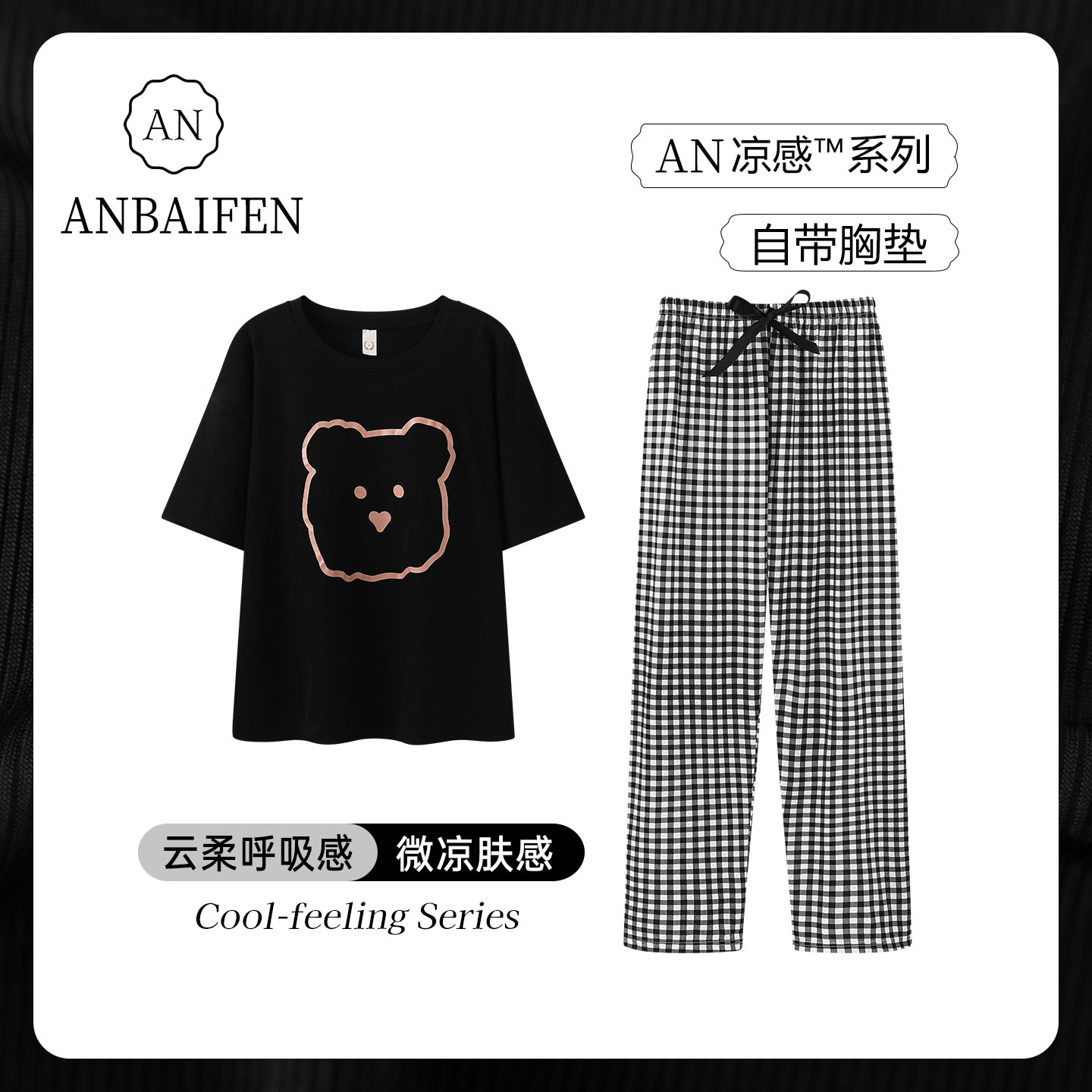 灰格小熊 带胸垫短袖 ins风格 莫代尔冰丝薄款 套装 子睡衣女夏季