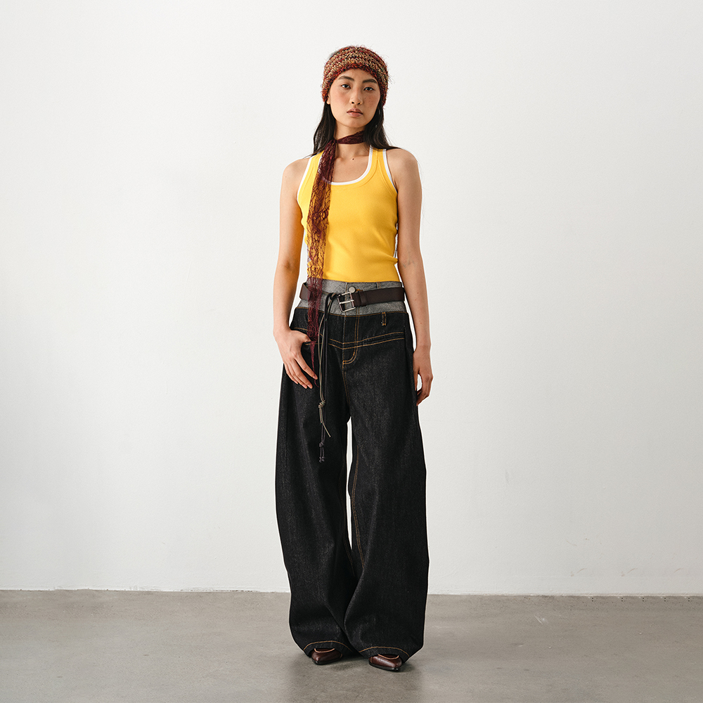 cleanfit双腰头假两件垂感弯刀裤 复古宽松阔腿牛仔裤 美式 DIMC女装