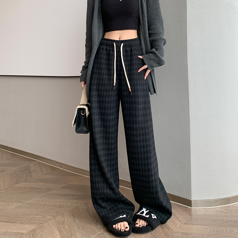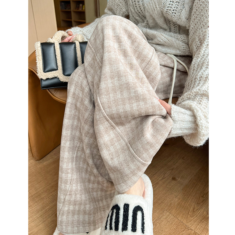 女 加绒加厚垂感高腰宽松显瘦复古格纹毛呢阔腿裤 羊毛格子裤 女冬季