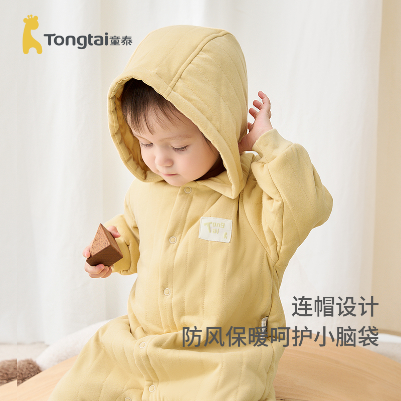童泰婴儿连体衣秋冬纯棉夹棉宝宝薄棉爬服男女童外出恒温连帽哈衣