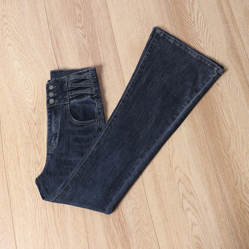 显瘦排扣设计马蹄微喇裤 高腰喇叭牛仔裤 加绒加厚修身 新款 子 女冬季