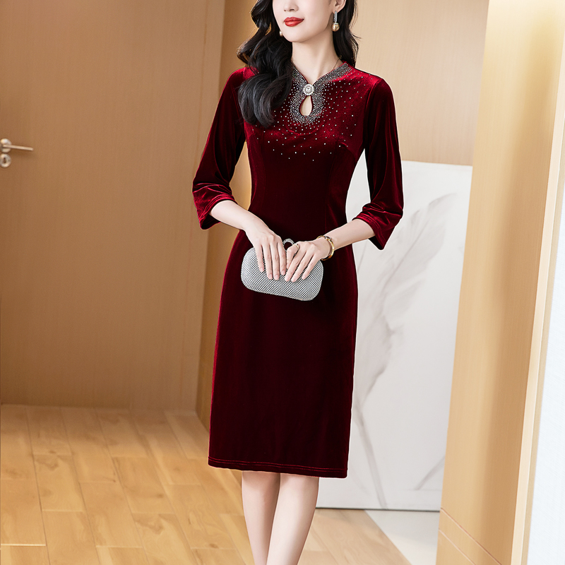 酒红丝绒连衣裙女2025年春秋新款 高端名媛气质金丝绒妈妈婚宴礼服