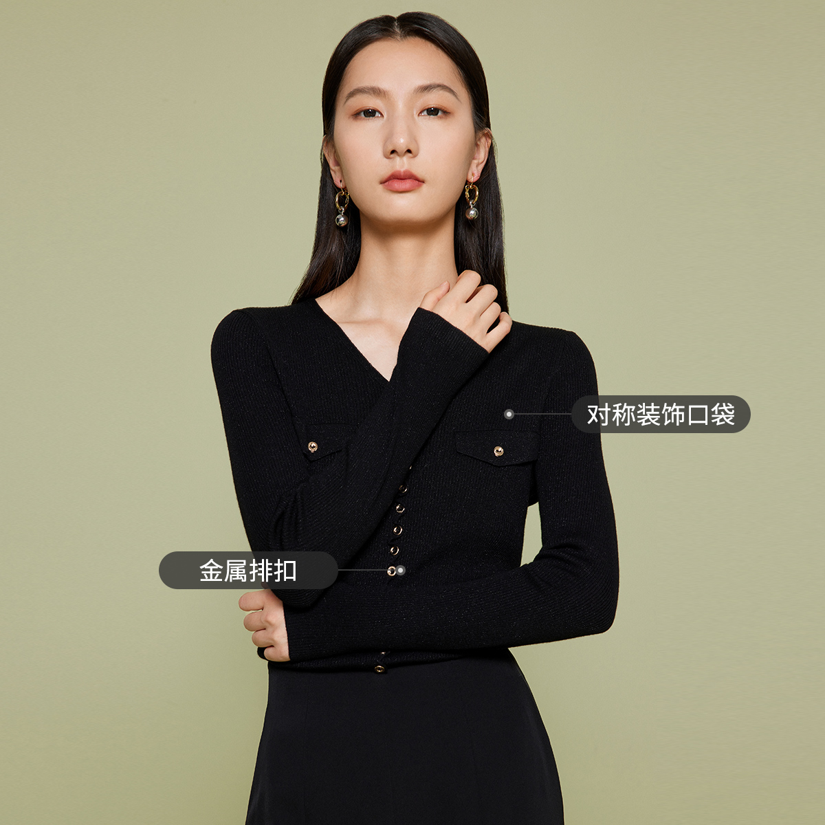 长袖 小香风套头衫 针织衫 毛衫 内搭 女2025春秋新款 谷邦黑色V领修身
