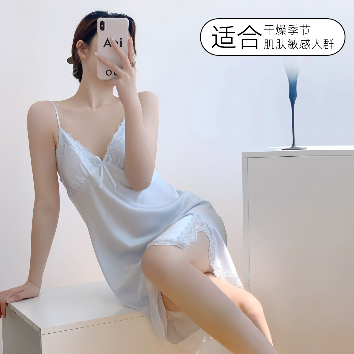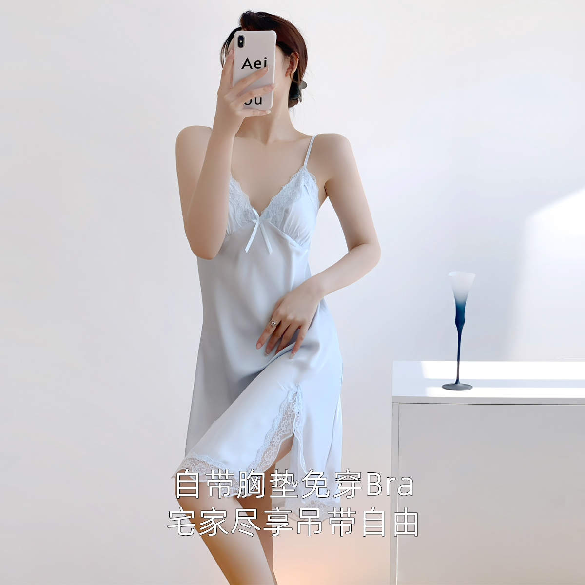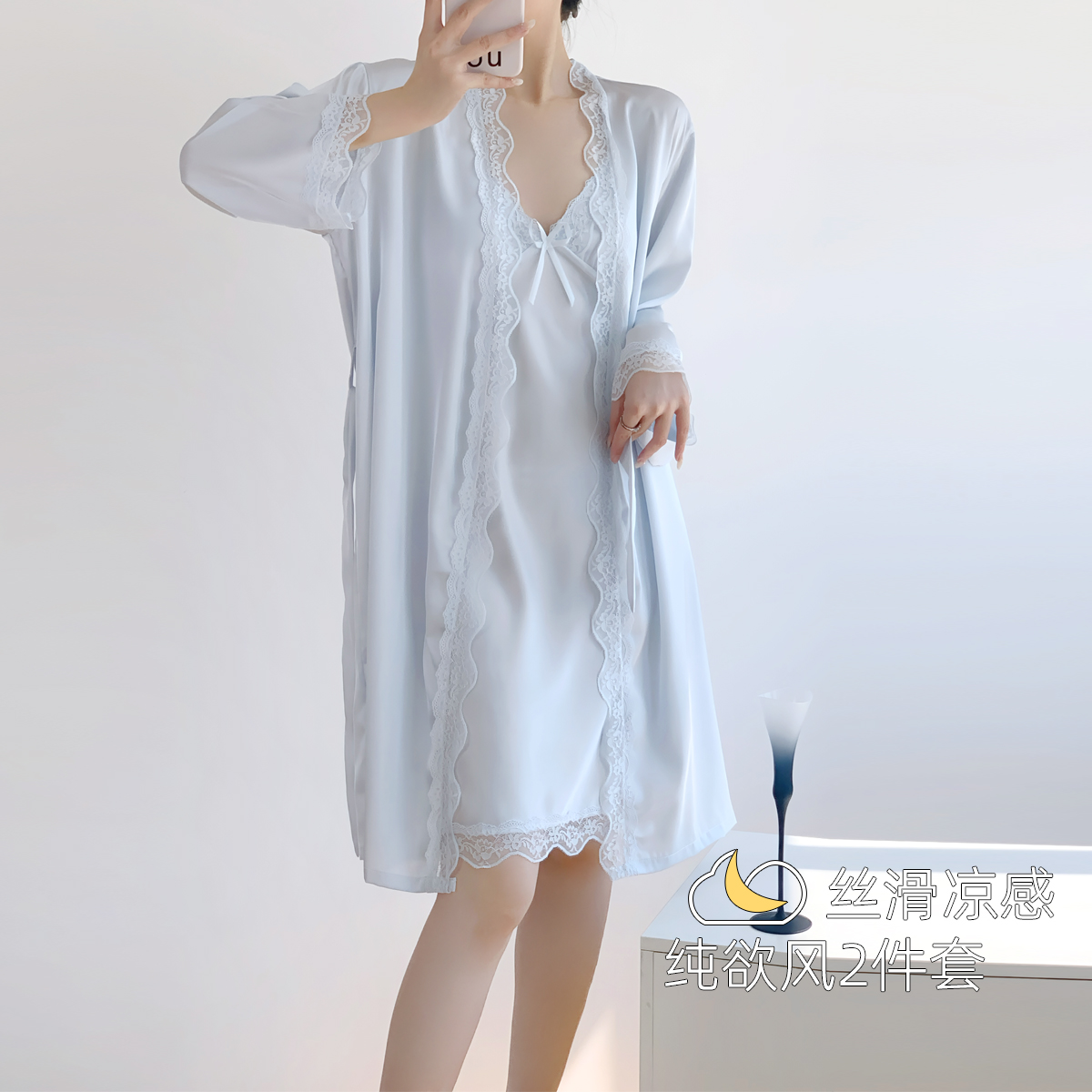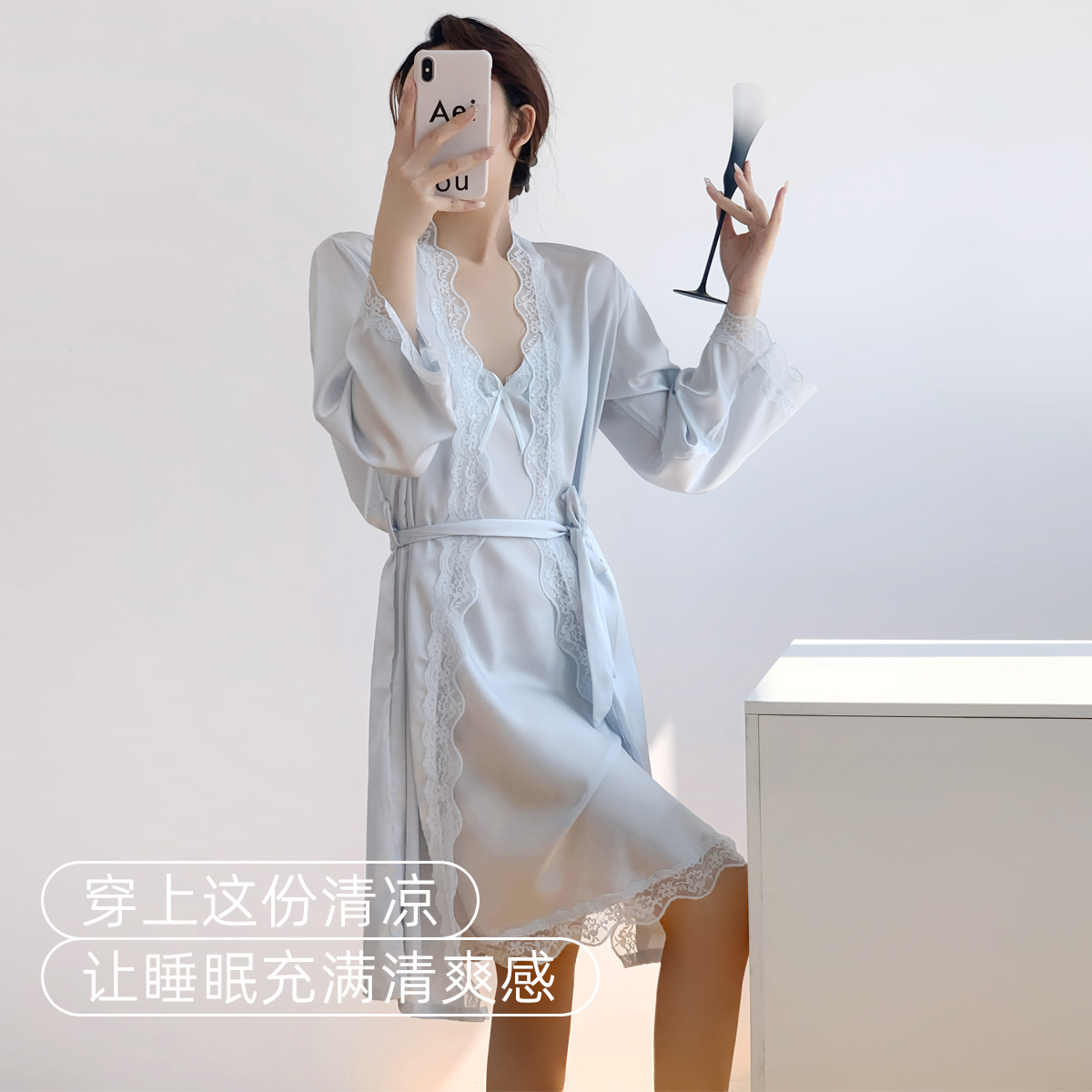2025新款 性感冰丝睡袍纯欲风高级感蕾丝吊带睡衣 睡裙女春秋夏薄款