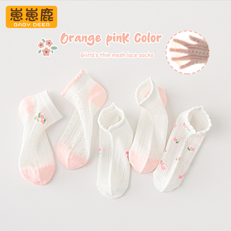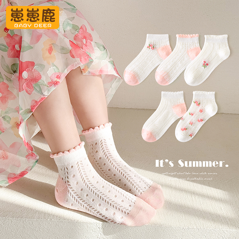 女童袜子夏季 浅粉网眼袜儿童公主碎花中筒袜春夏甜美花边短袜 薄款