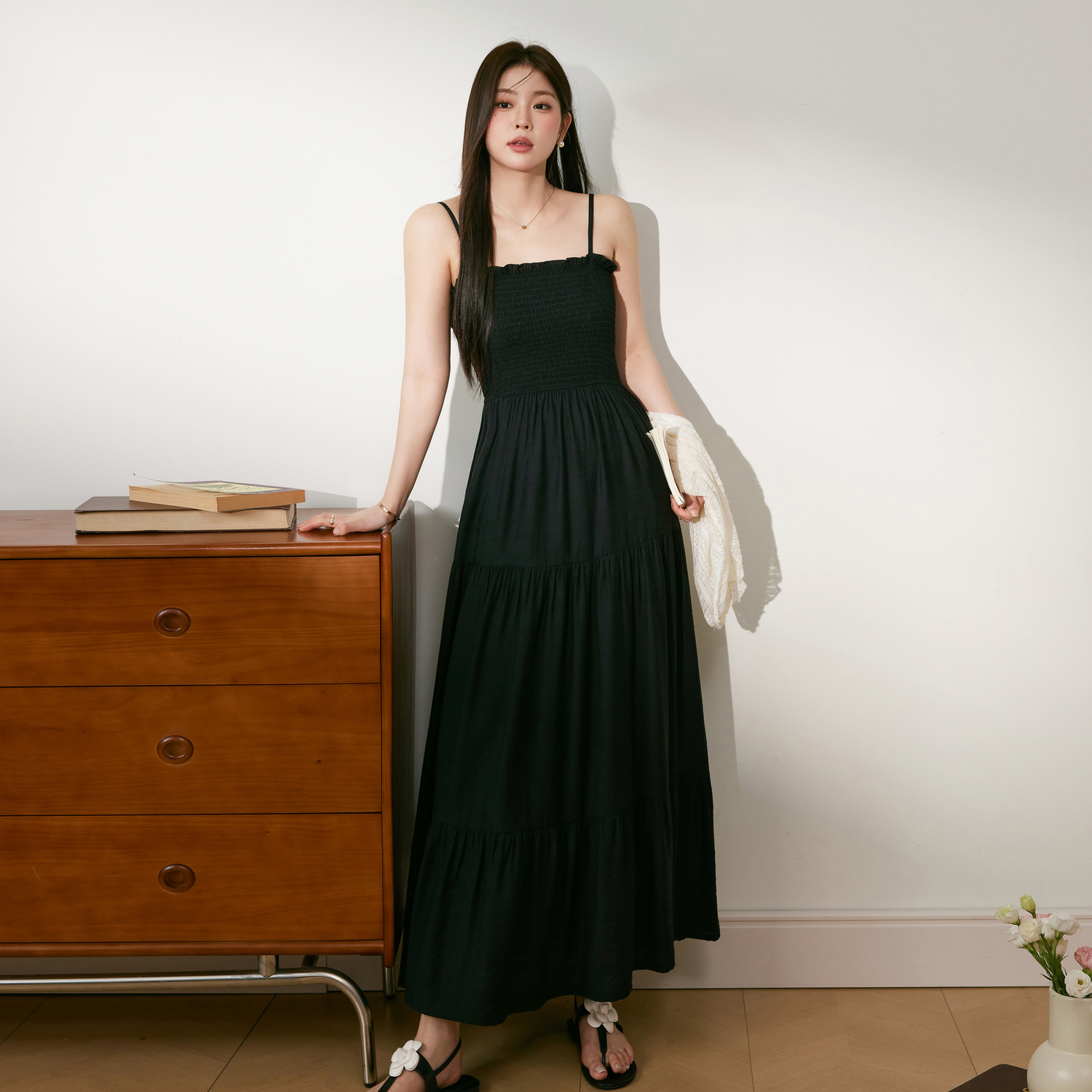 显瘦遮肉套装 蓝语大码 夏新款 胖mm气质黑色吊带连衣裙外搭开衫 女装