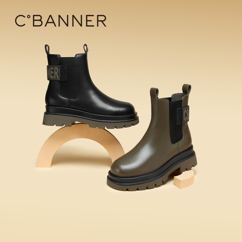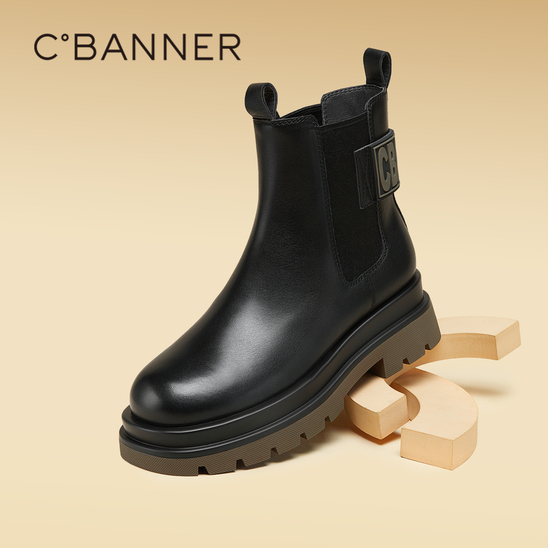 千百度女鞋 厚底烟筒靴短靴靴子增高 秋冬气质切尔西靴潮流真皮时尚