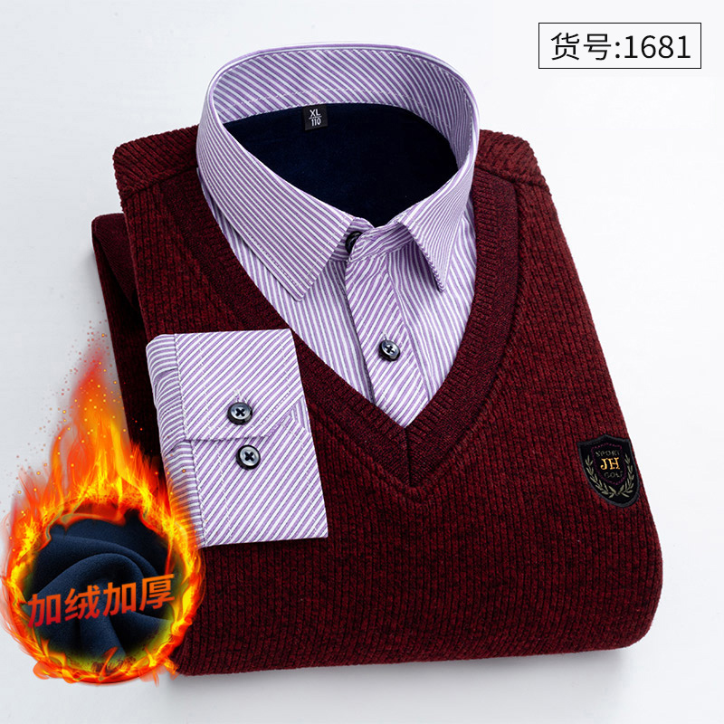 上衣 领中年针织毛衣爸爸男装 男士 保暖内衣青年加绒加厚假两件衬衫