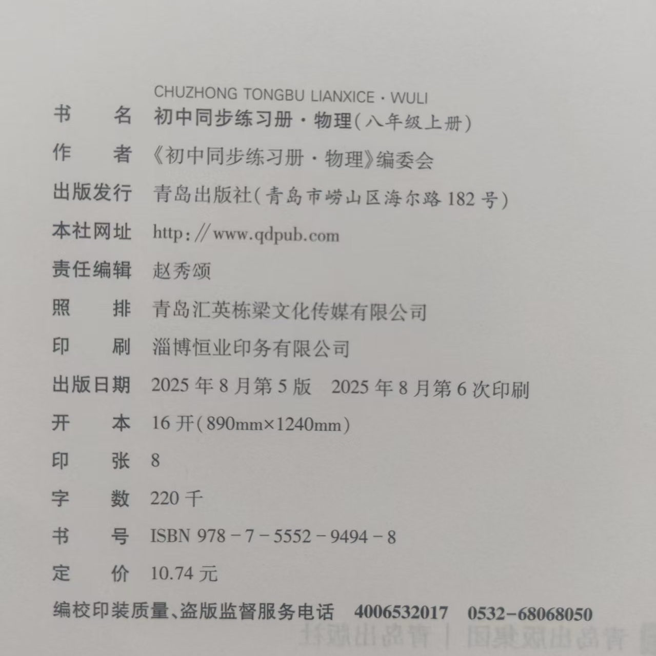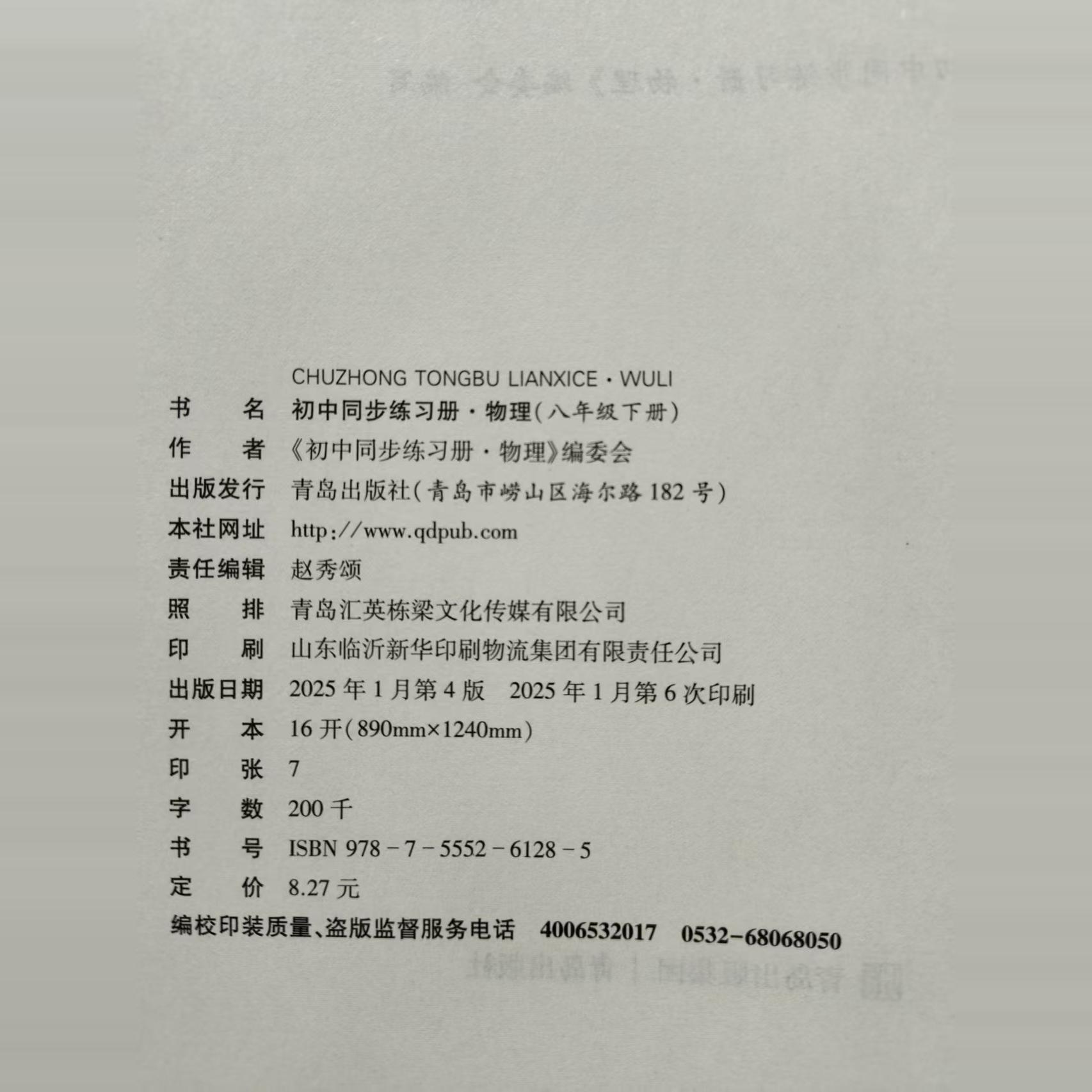 社初中八年级物理上册下册同步练习册上下册配人教版 初中同步练习册物理八年级上下册青岛出版 六三制配人教版 2025年新版