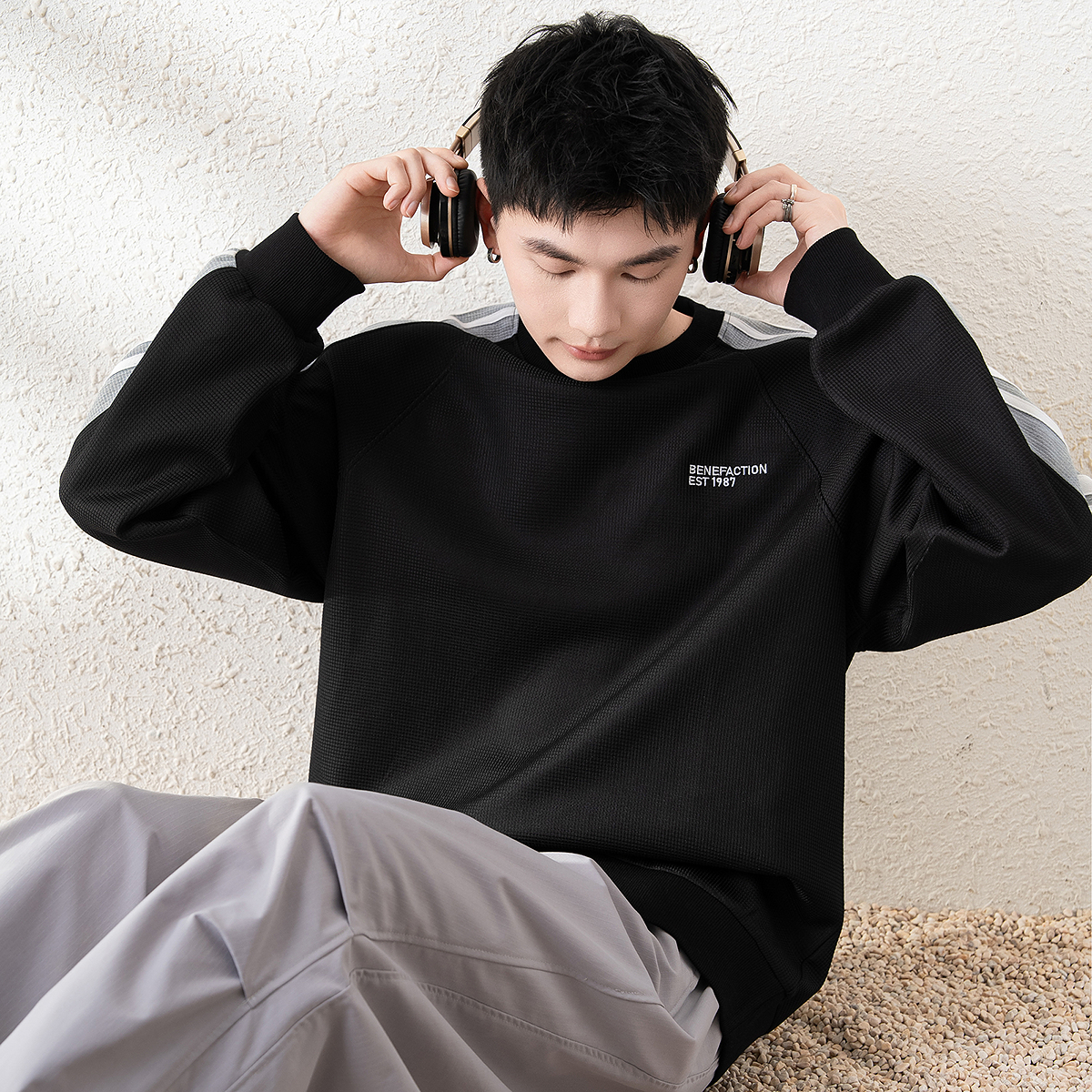 宽松拼接插肩袖 圆领卫衣男美式 上衣休闲简约外套 新款 唐狮2025春季