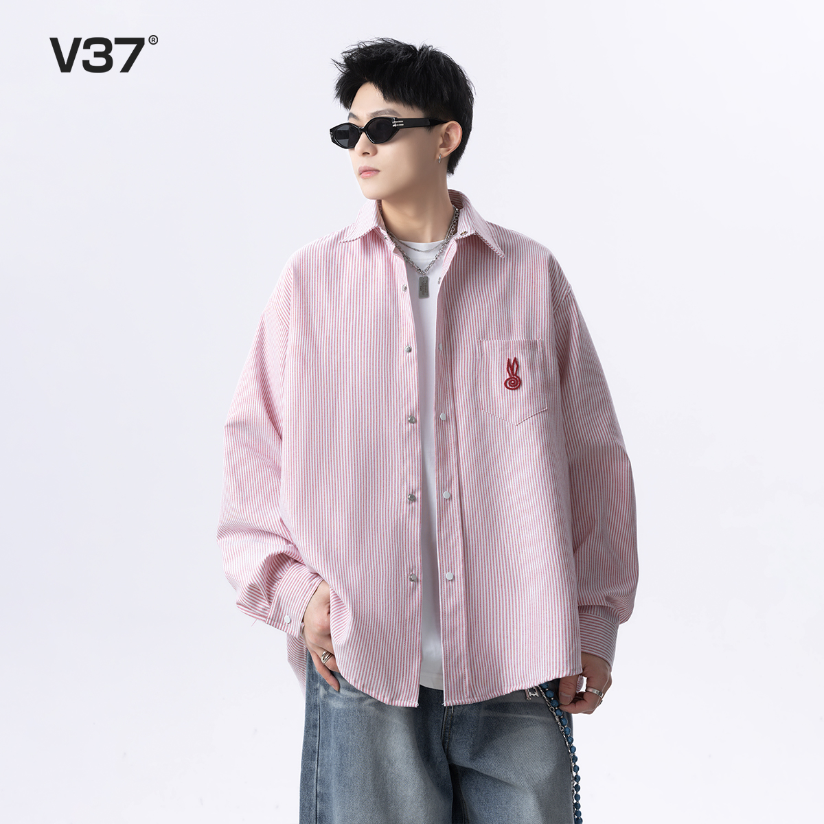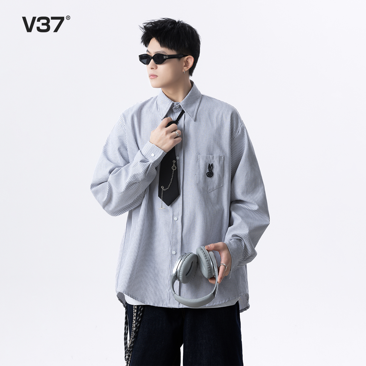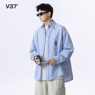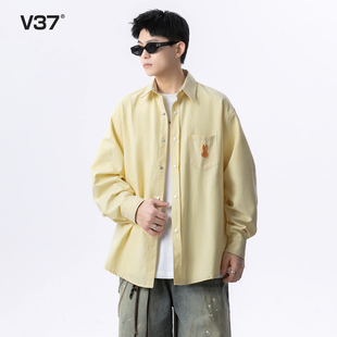 潮牌刺绣青少年条纹衬衣外套 男秋2025新款 V37多巴胺黄色长袖 衬衫