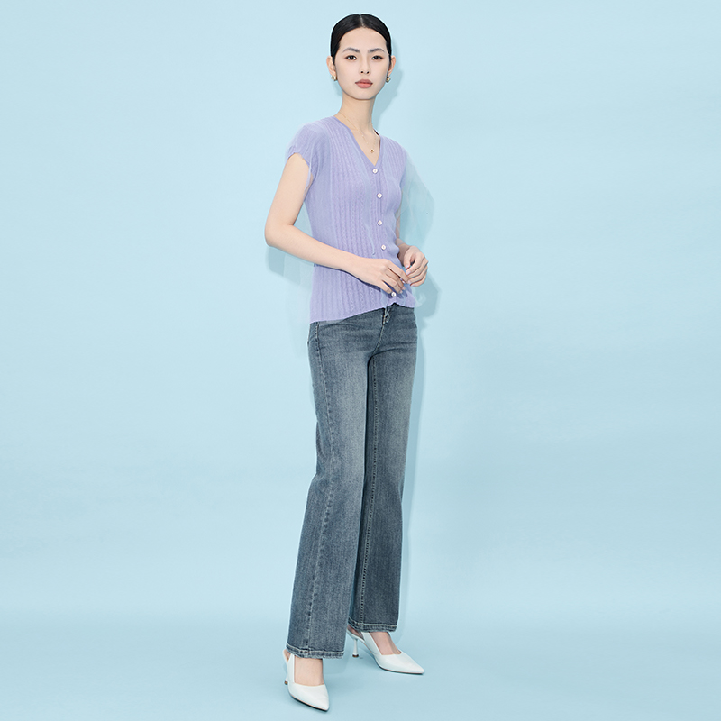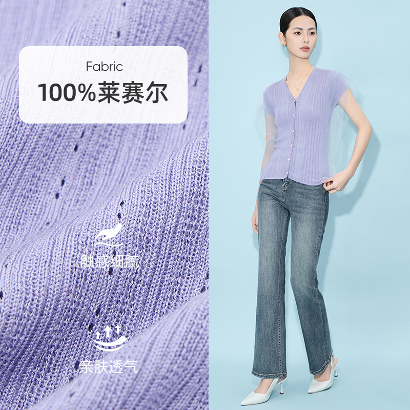 气质上衣女 网纱短袖 马天奴2025春夏新款 紫色莱赛尔V领提花针织衫