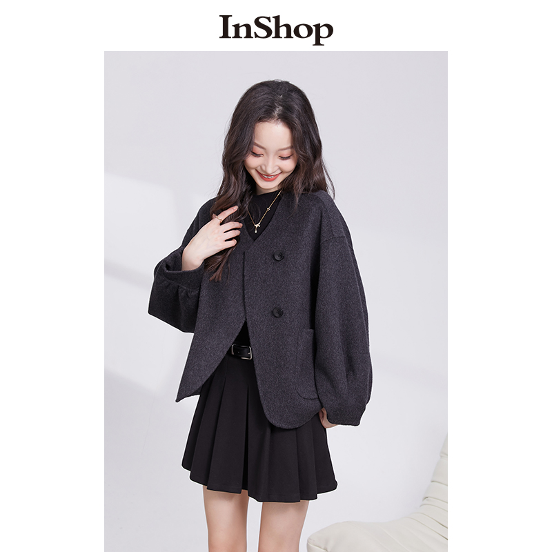 短款 气质灯笼袖 INSHOP新款 毛呢外套女圆弧下摆呢大衣 商场同款