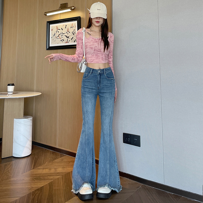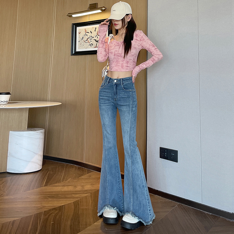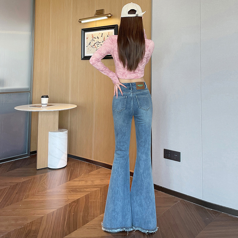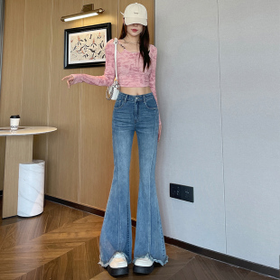 高腰弹力显瘦毛边喇叭裤 2025年新款 女春秋装 浅蓝色开叉微喇牛仔裤
