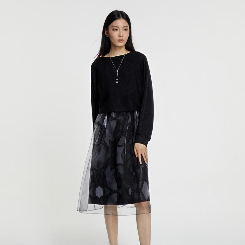 新款 显瘦连衣裙女2025秋季 气质百搭开叉中长A字裙子 拼接长袖 时尚