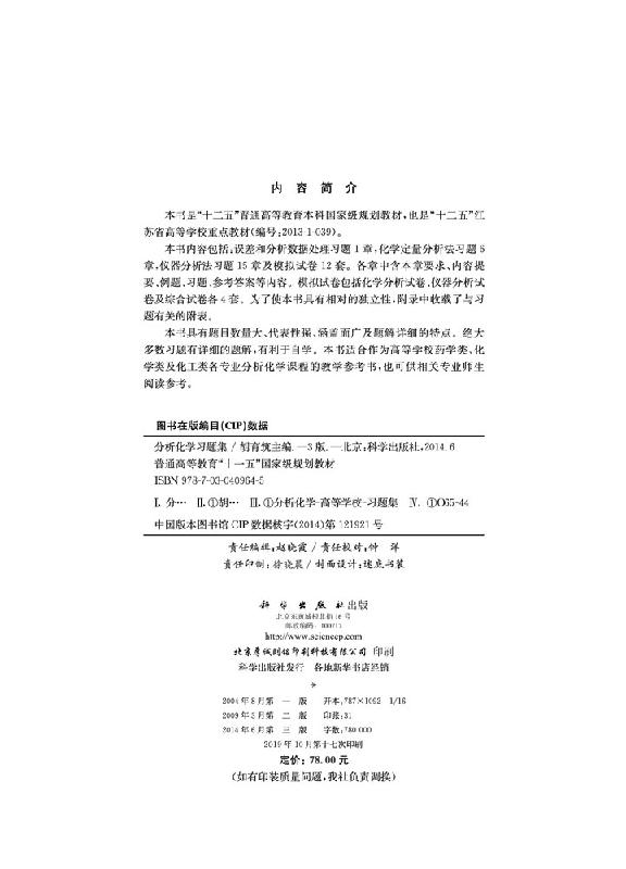 编 胡育筑 十一五 规划教材 社 分析化学习题集 科学出版 第三版