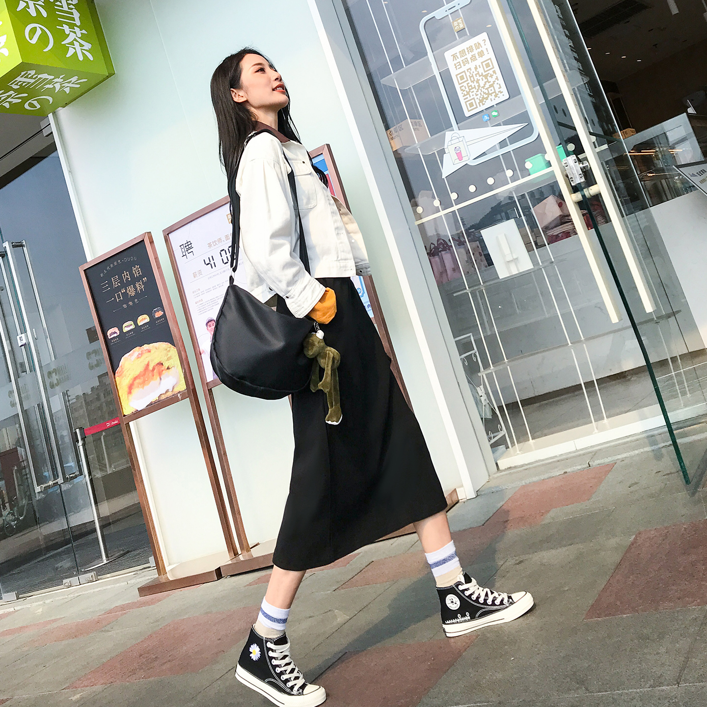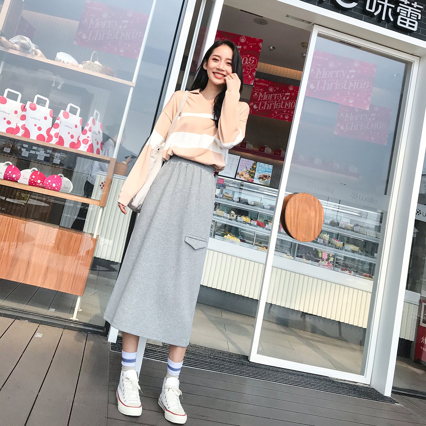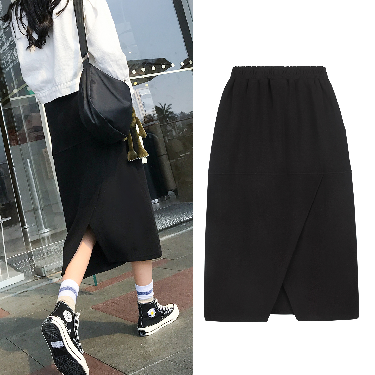 开叉半身裙女春秋中长款 口袋休闲直筒裙 高腰遮腿显瘦百搭宽松大码