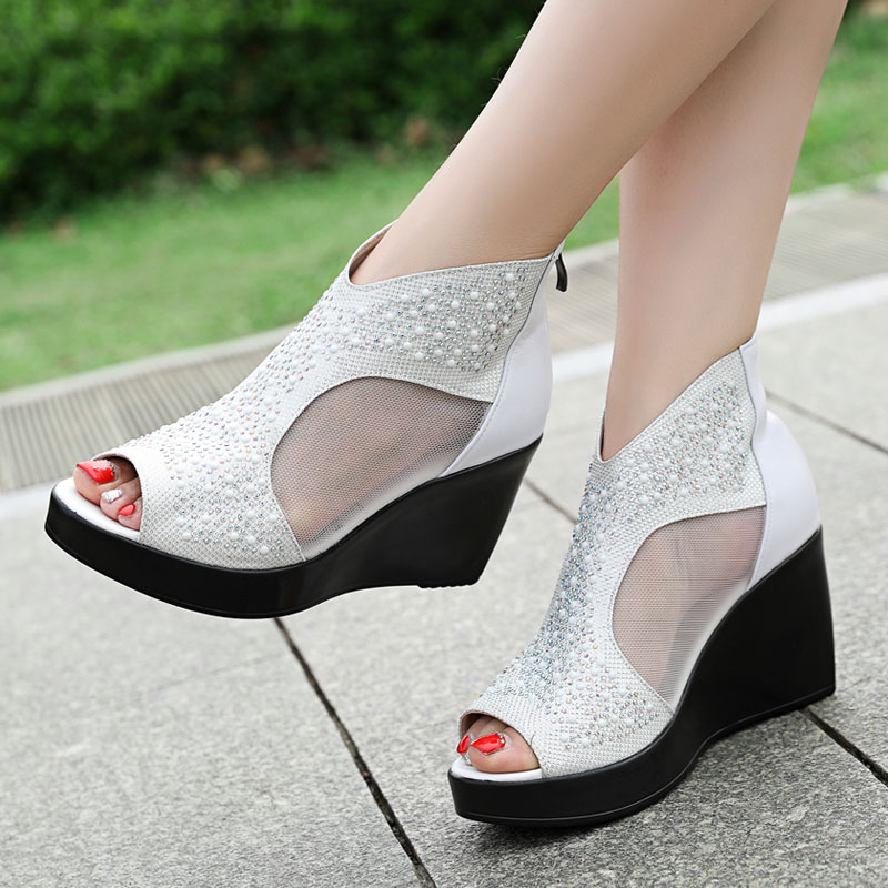 女凉鞋 坡跟厚底镂空网纱水钻女鞋 2025新款 高跟鞋 凉靴 春夏季 鱼嘴鞋