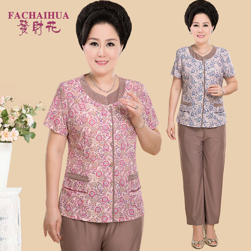 妈妈装 夏装 套装 短袖 发财花中老年女装 奶奶夏季 上衣 库存清仓