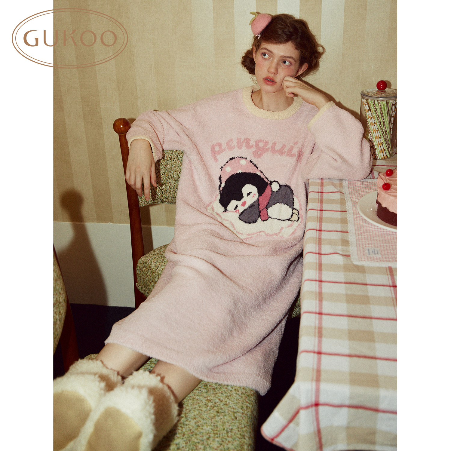 可爱半边绒女士家居服套装 小企鹅印花新款 果壳睡裙女冬季 Gukoo
