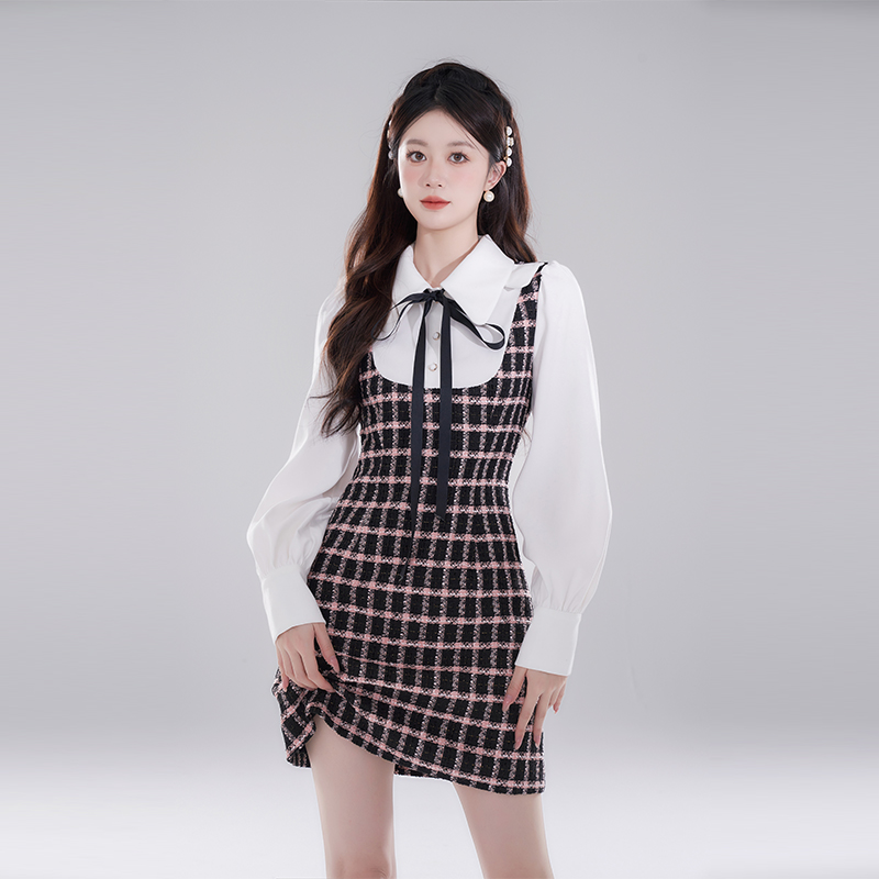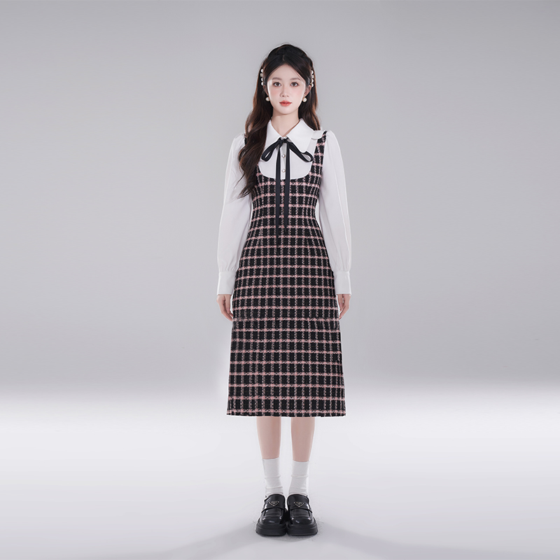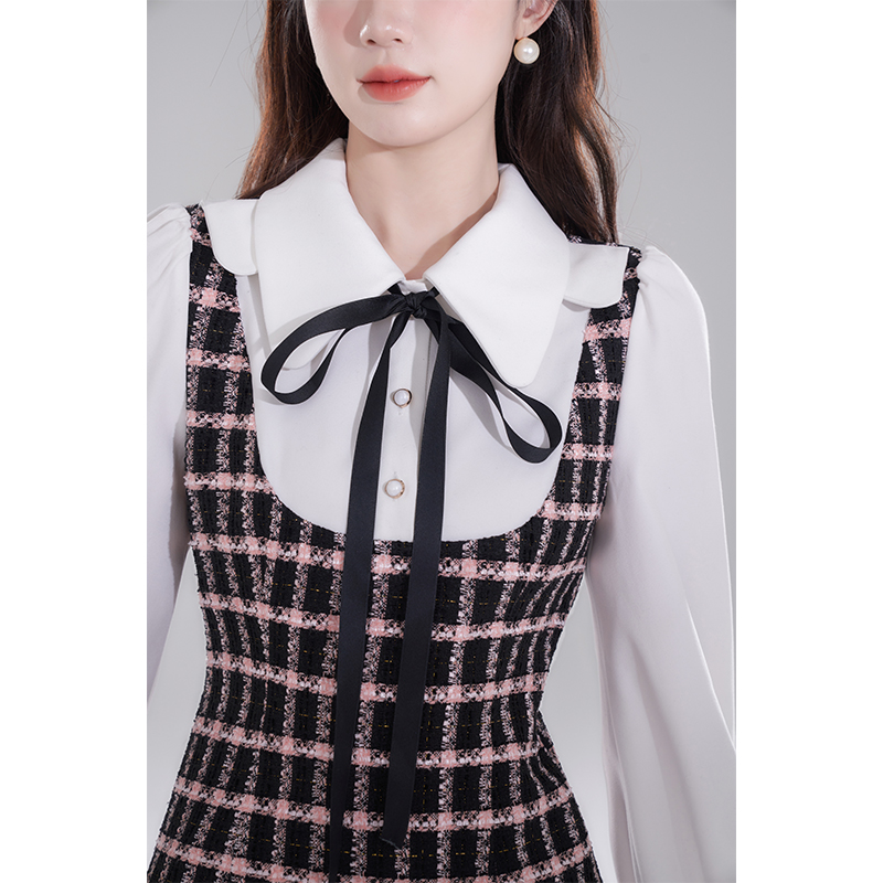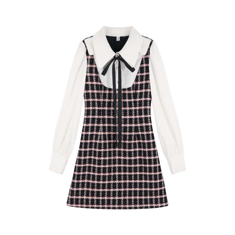 法式 学院风假两件毛呢格子连衣裙女小香风秋冬季 小个子 清仓价