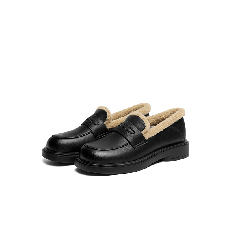 冬季 乐福鞋 加绒加厚毛边时尚 女一脚蹬真皮毛毛鞋 单鞋 红蜻蜓妈妈鞋