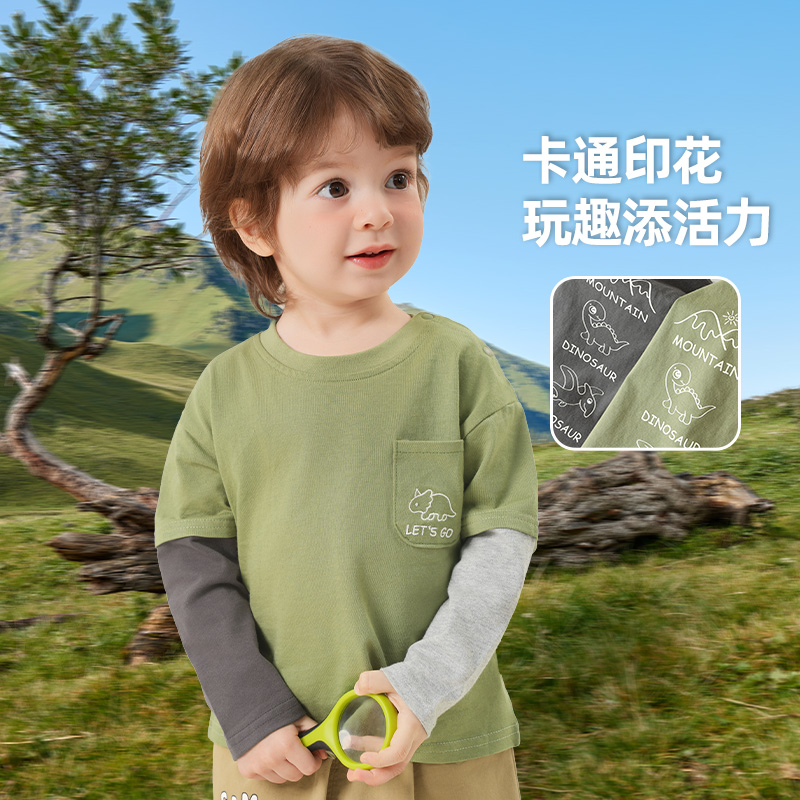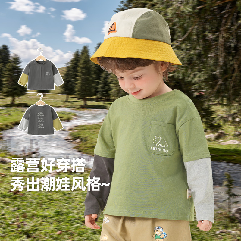 上衣秋款 婴儿假两件衣服春秋长袖 打底衫 咔咔熊猫男童纯棉T恤秋季
