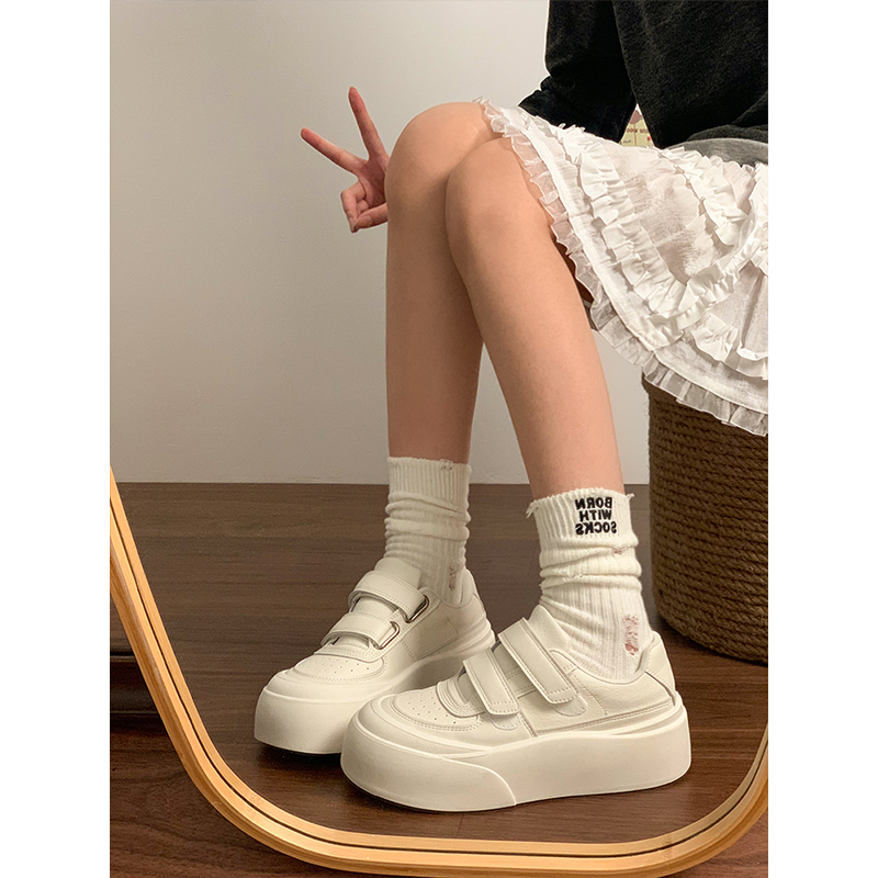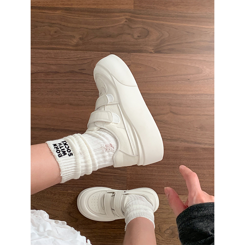 女2025春季 透气休闲运动鞋 款 增高面包鞋 魔术贴厚底小白鞋 白色板鞋