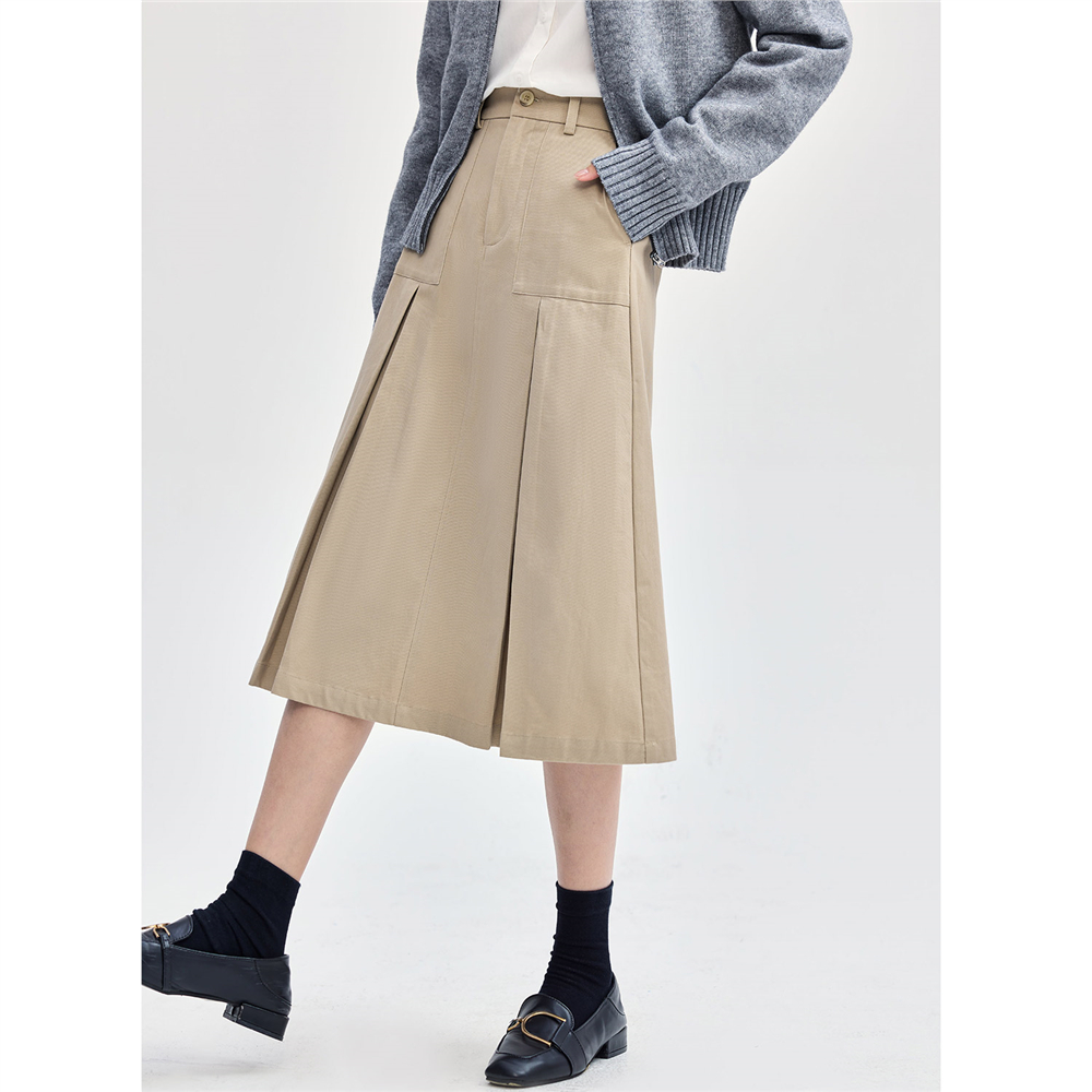 佐丹奴长款 伞裙女纯棉磨毛通勤压褶A字裙半松紧腰半身裙05464701