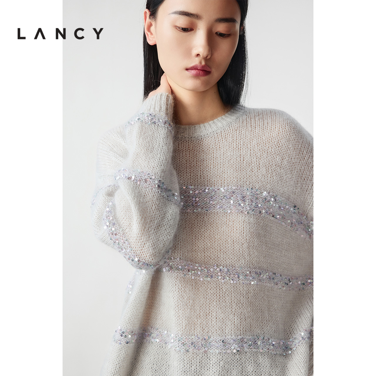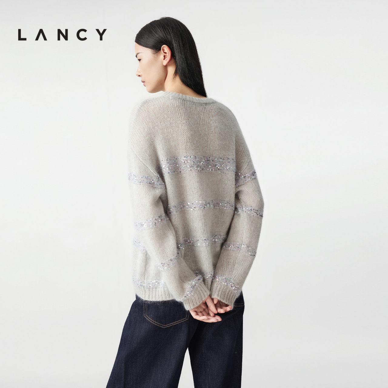 亮片拼色条纹马海毛圆领针织衫 法式 上衣女秋 朗姿2025冬新款 LANCY