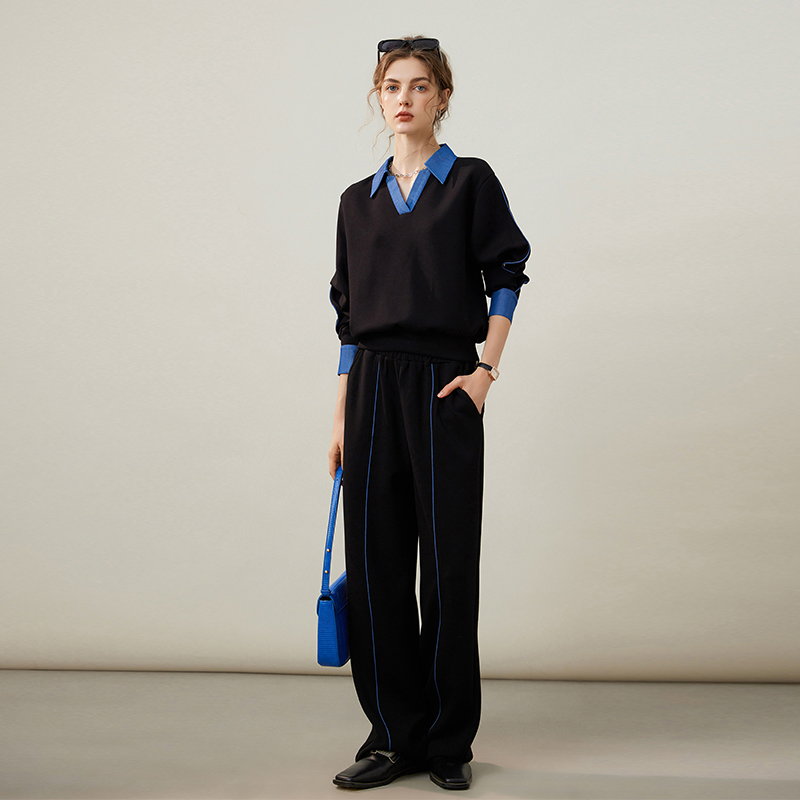 套装 显瘦女式 异形翻领上衣中缝休闲裤 白鹿语撞色拼接两件套25秋款