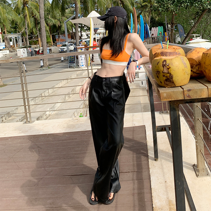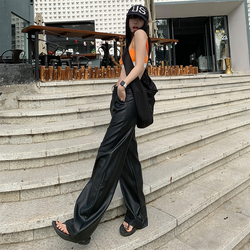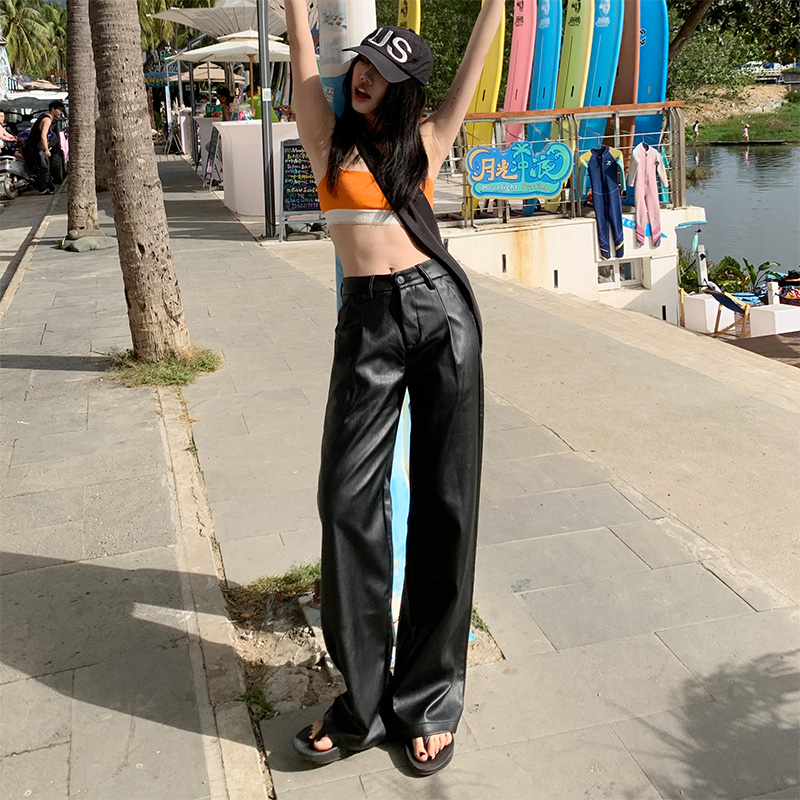 显瘦百搭直筒阔腿休闲长裤 美式 女2025新款 KRO黑色PU高腰辣妹皮裤